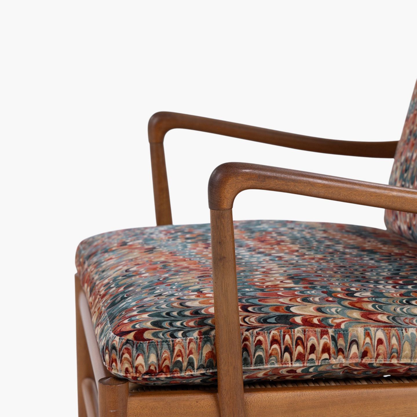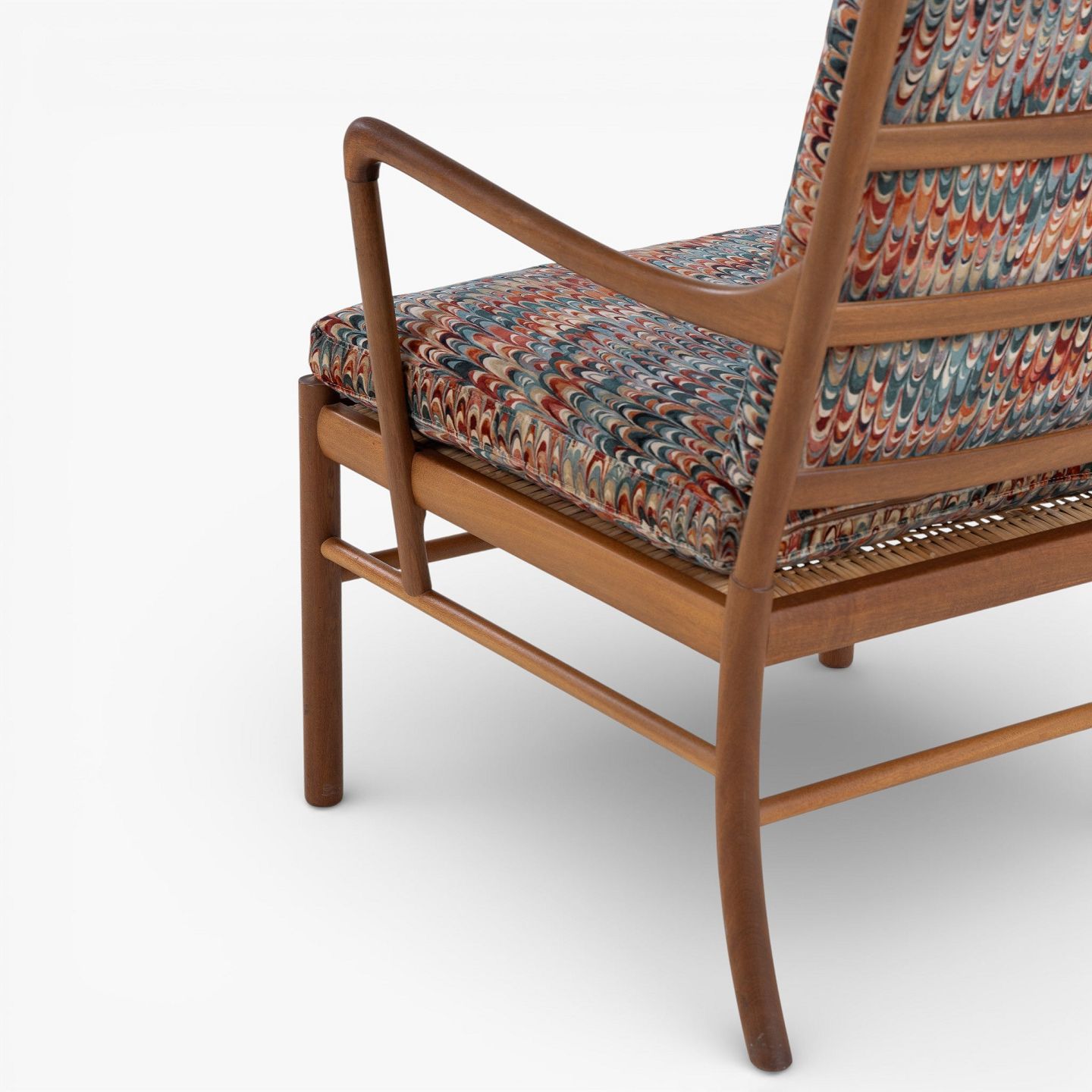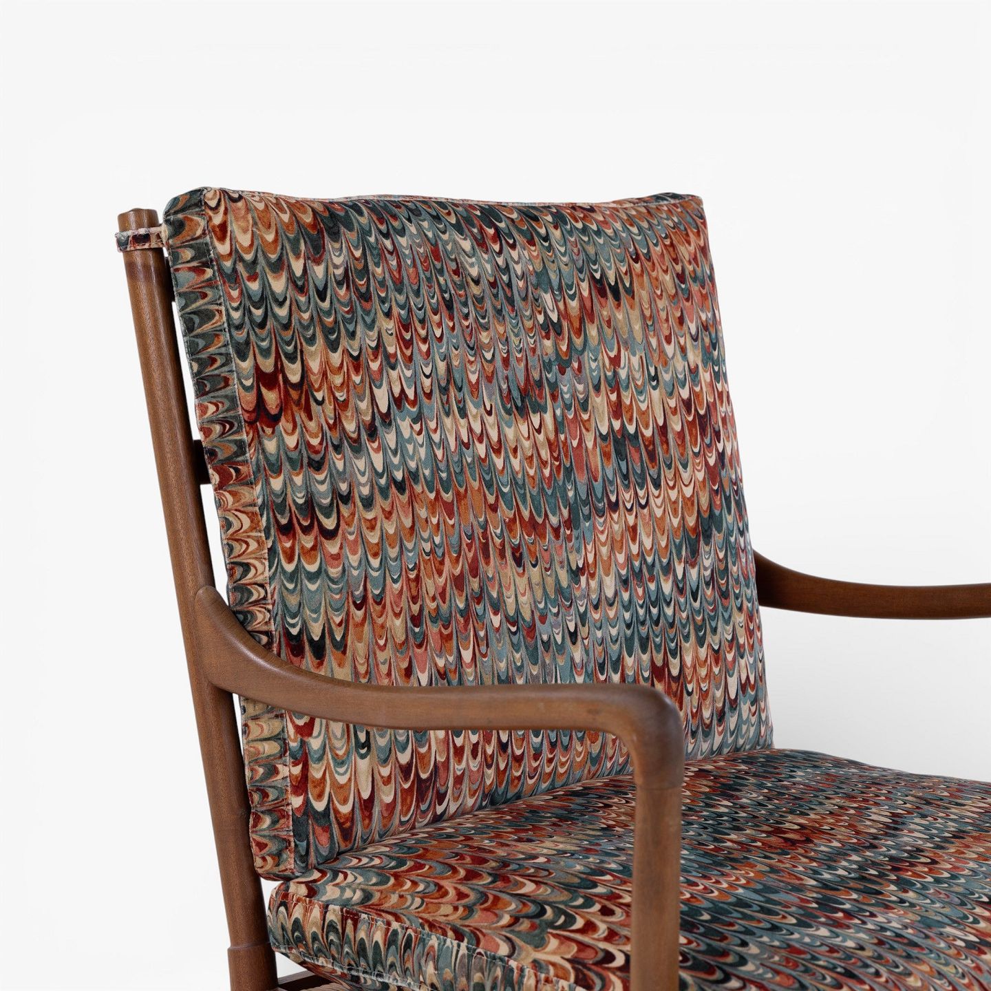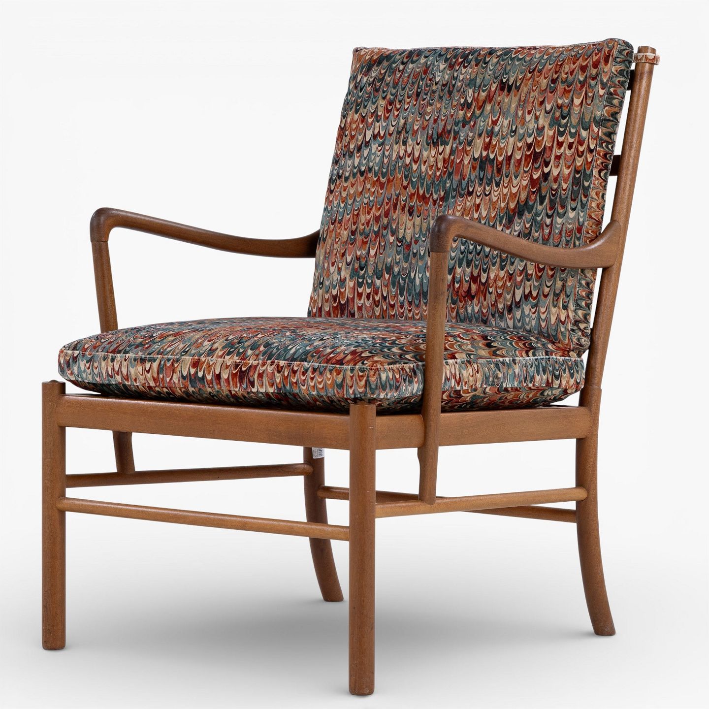 PJ 149 - 'Colonial Chair' armchair in patinated mahogany with newly upholstered cushions in 'End Paper Velvet' fabric. Manufacturer's mark.