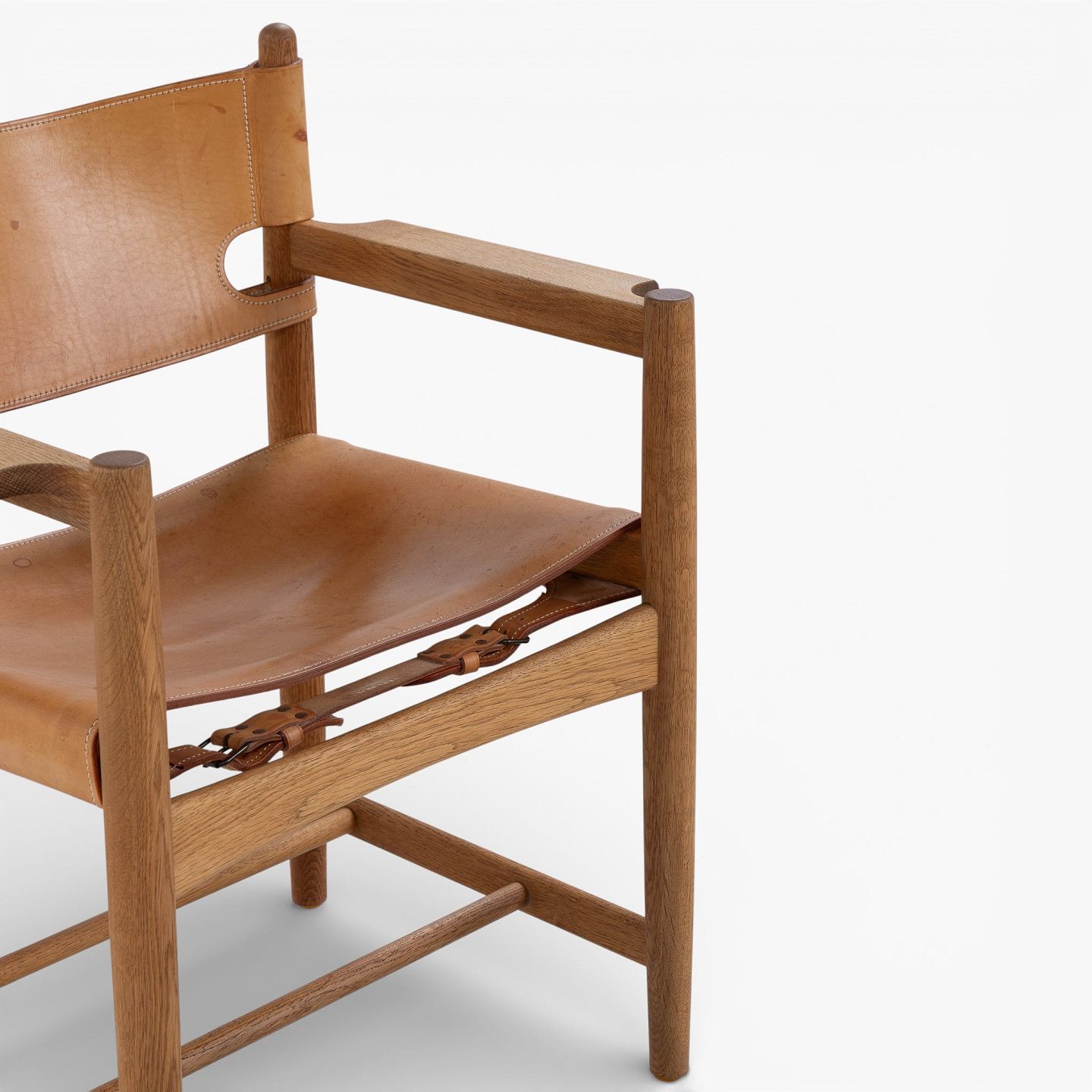 BM 3238 - 'Hunting chair' in patinated oak and full grain leather with armrests. Manufacturer's mark.