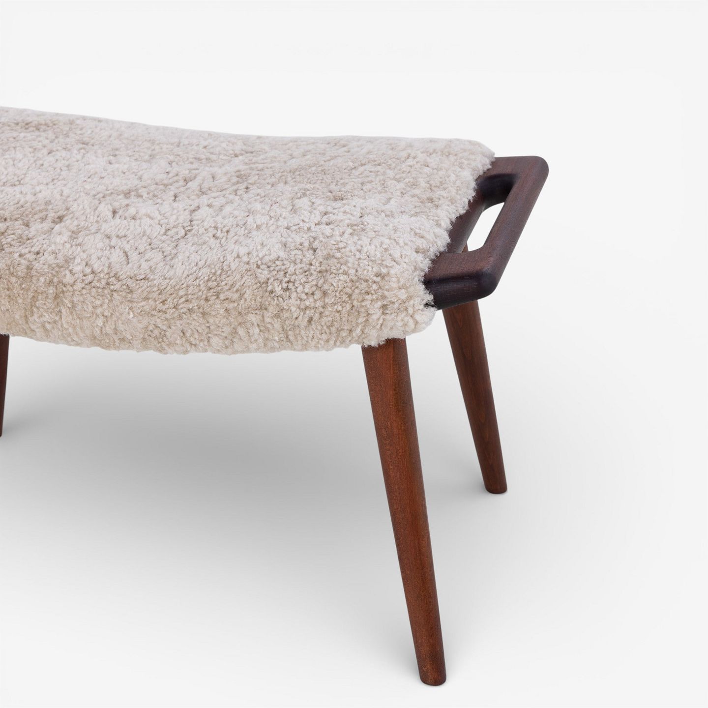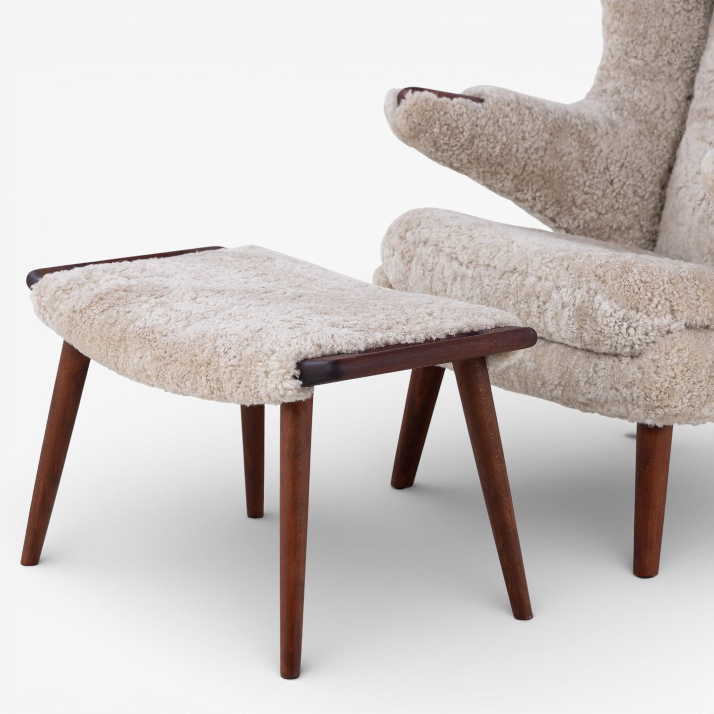 AP 19 - Newly upholstered Teddy Bear chair in lambskin (color: Moonlight) with stool.
