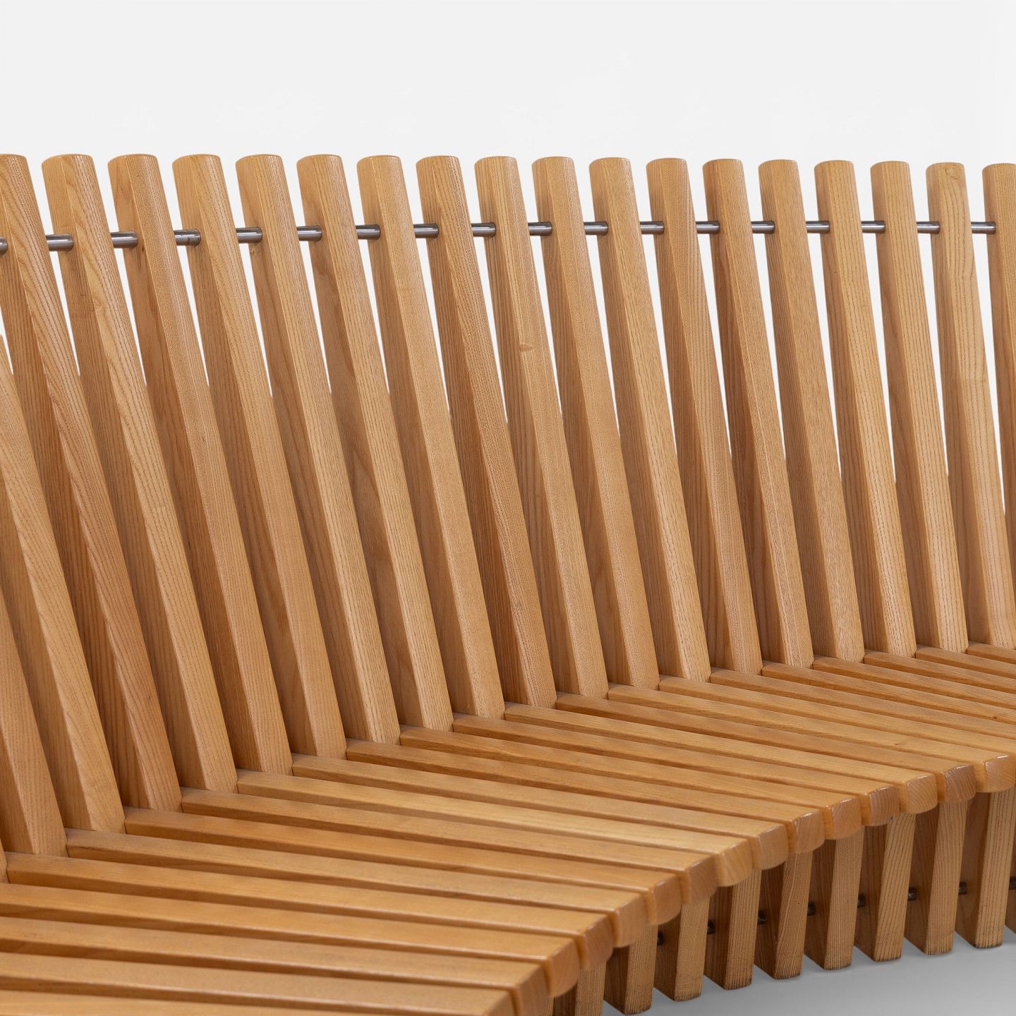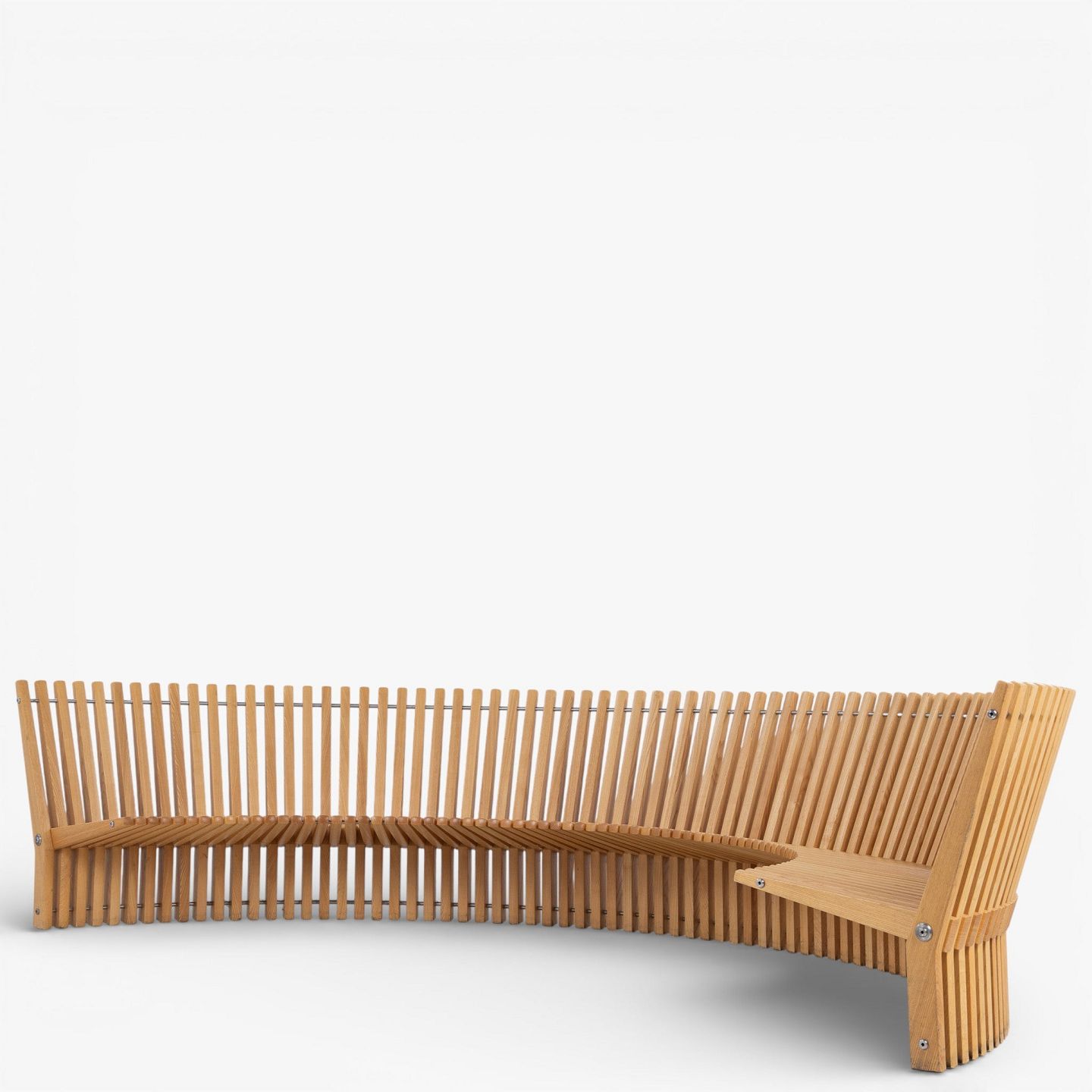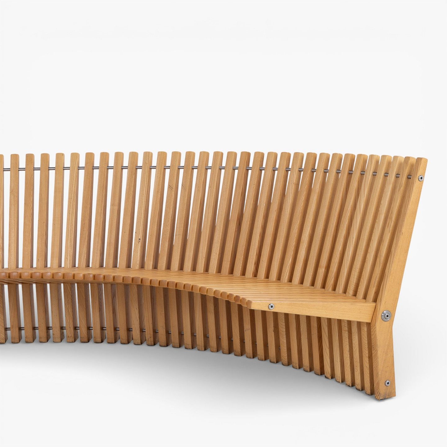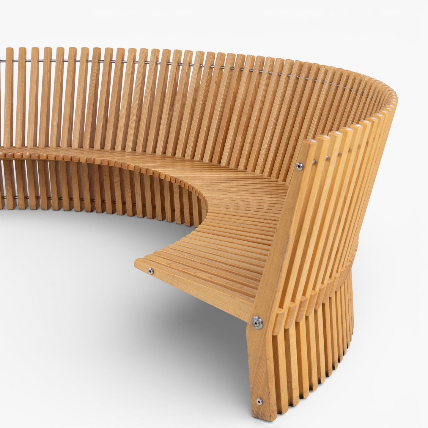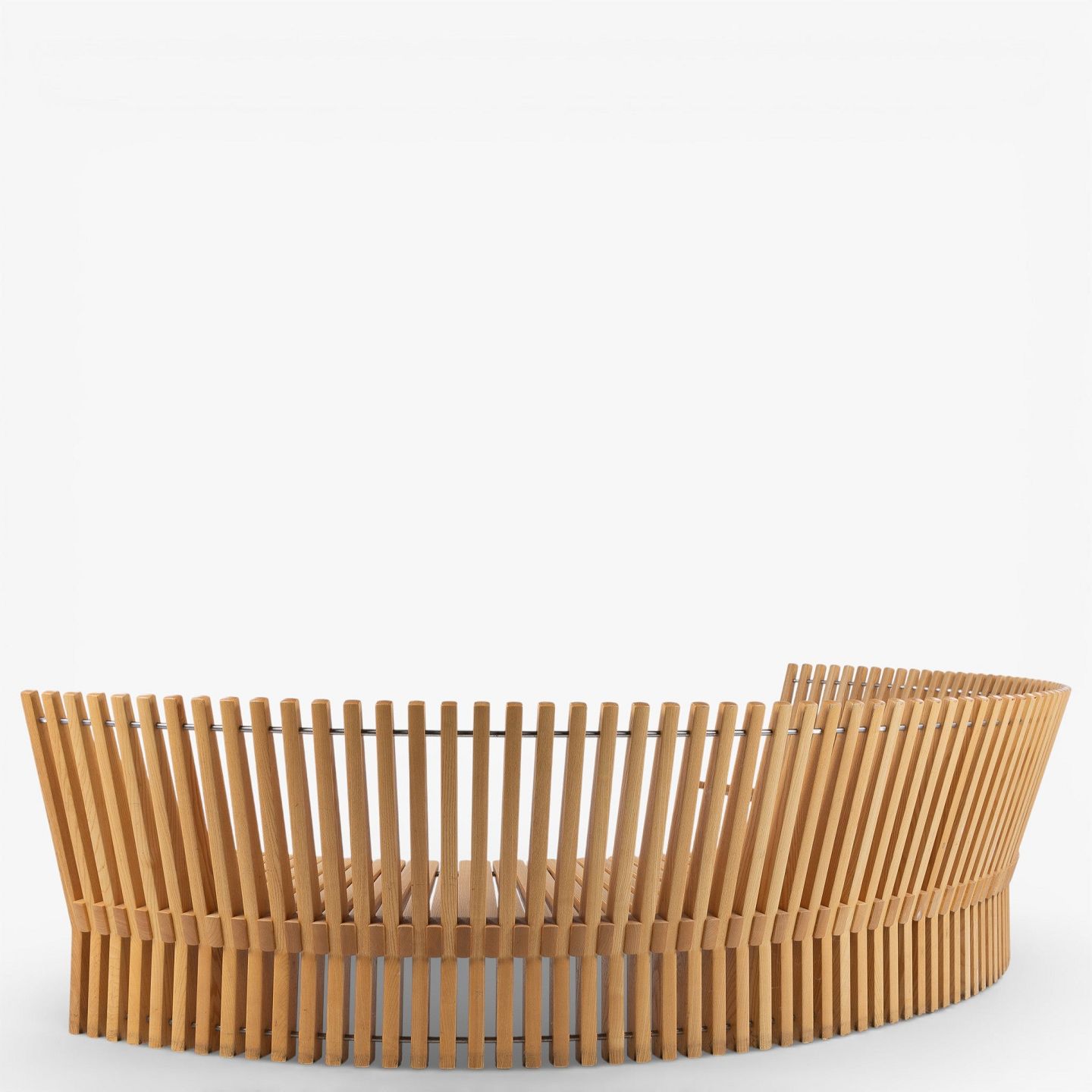 'Astral' bench in solid patinated elm wood in the shape of a semicircle. Designed in 1979.