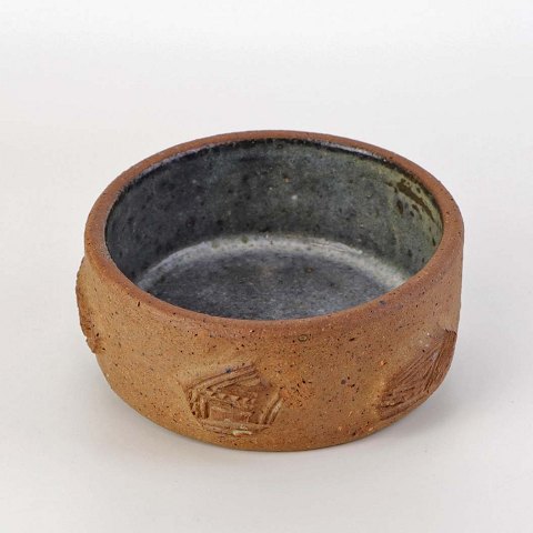 Lille rund skål i keramik med grå glasur på indersiden samt abstrakt mønstret yderside i uglaseret keramik.