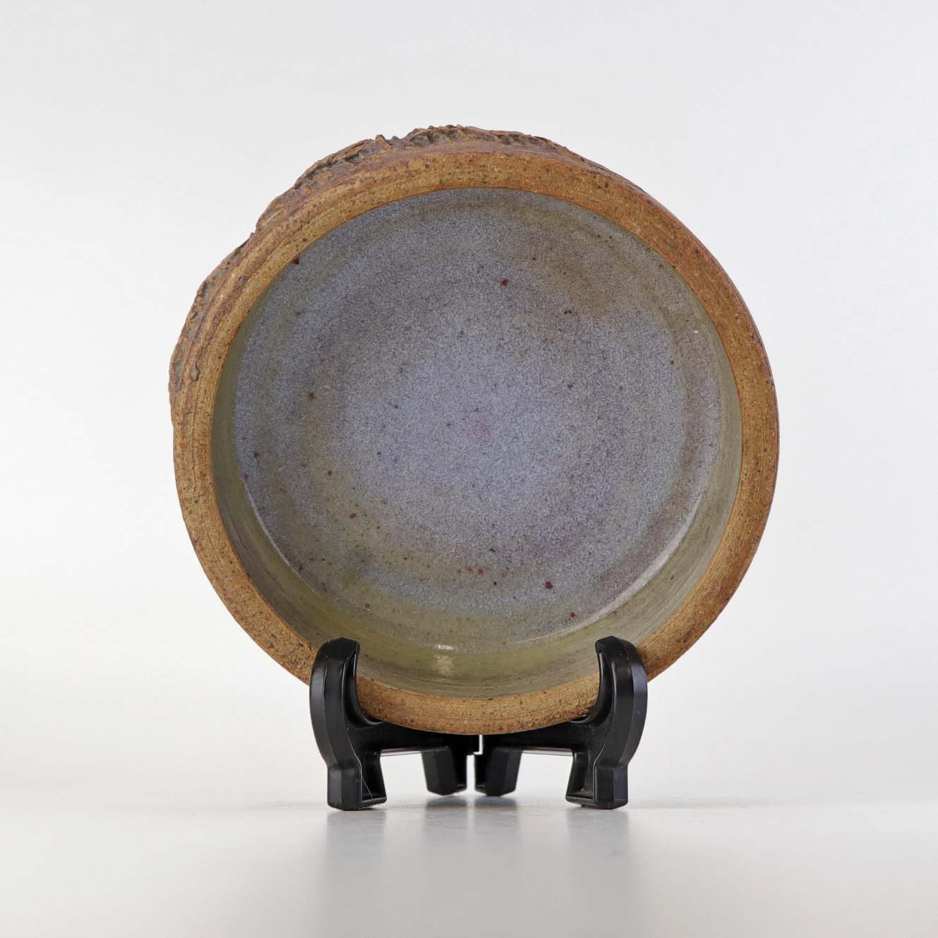 Rund skål i keramik med beige, grå og lyseblå glasur på indersiden samt uglaseret abstrakt mønster på ydersiden.