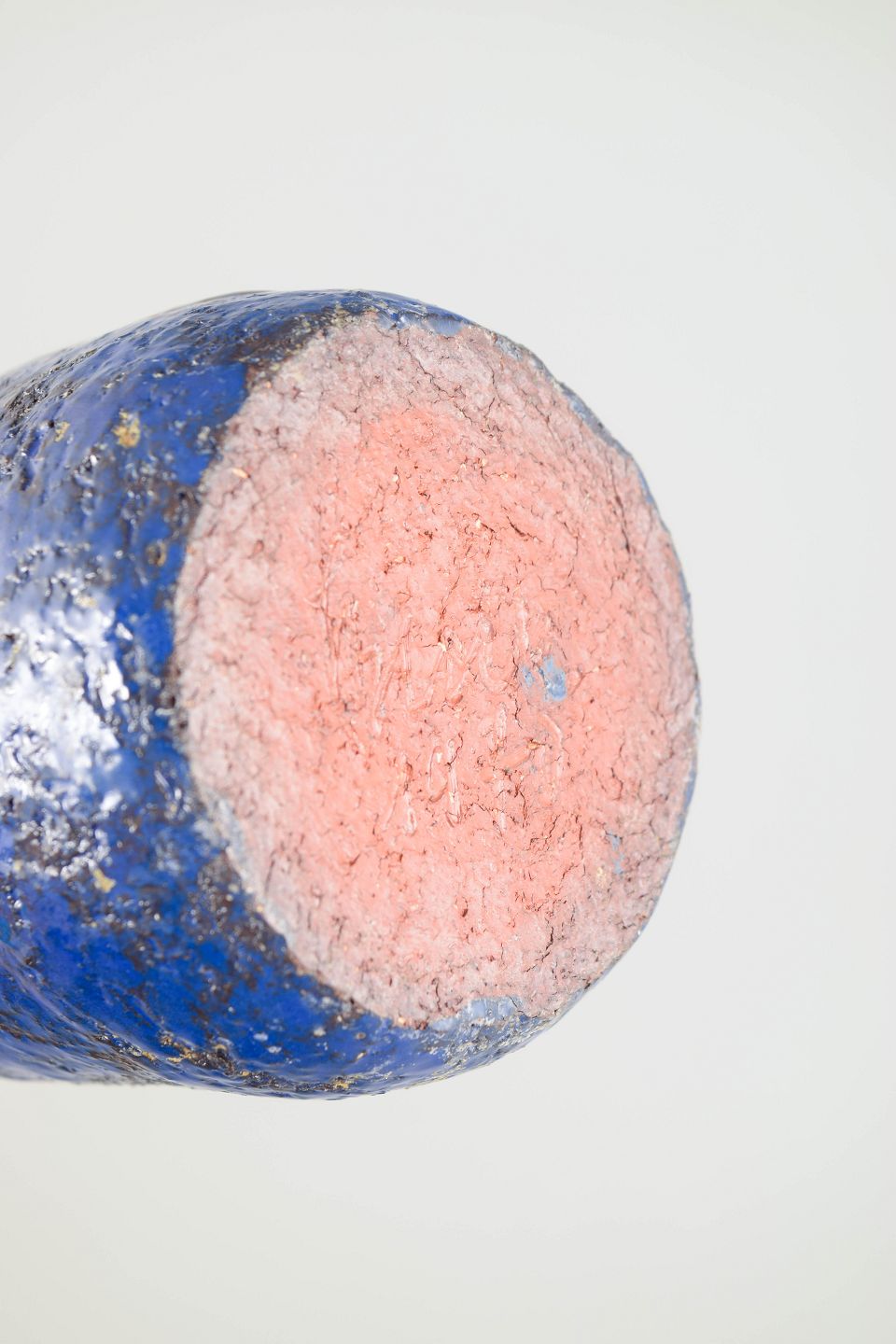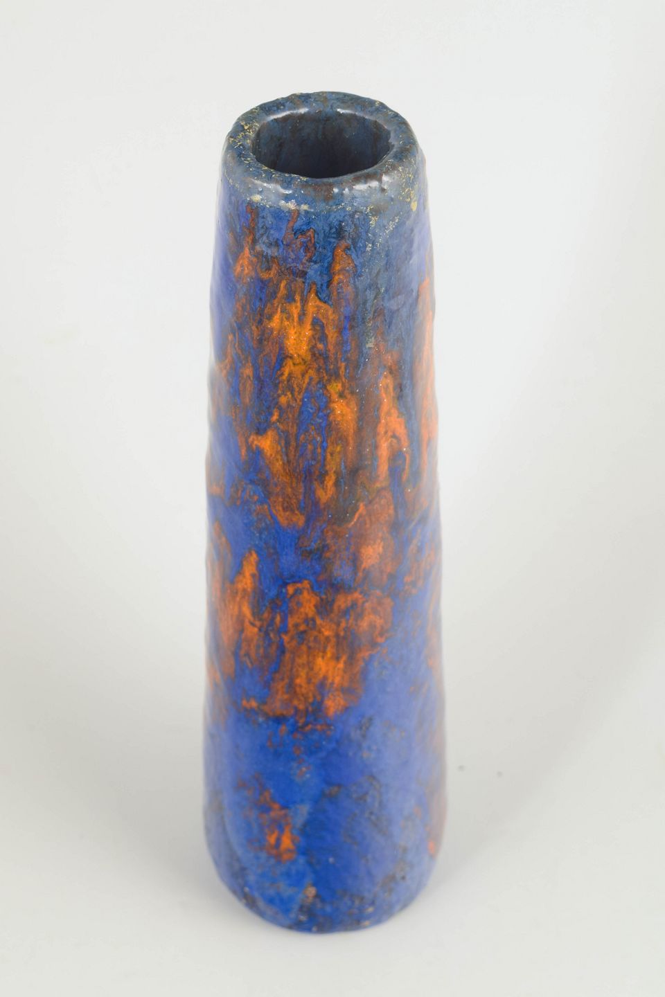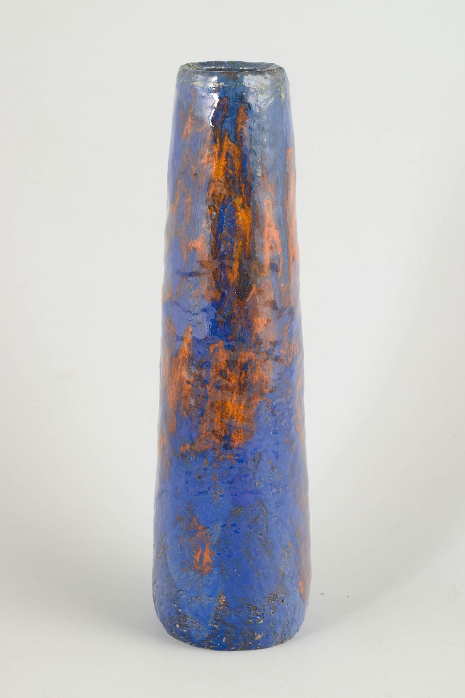 Very tall and slender vase in stoneware featuring a rare and experimental surface technique. The glaze appears in deep blue tones with strong vertical flows in warm rust and earthy hues, creating a striking and dynamic expression. The restrained form emphasises its sculptural character.