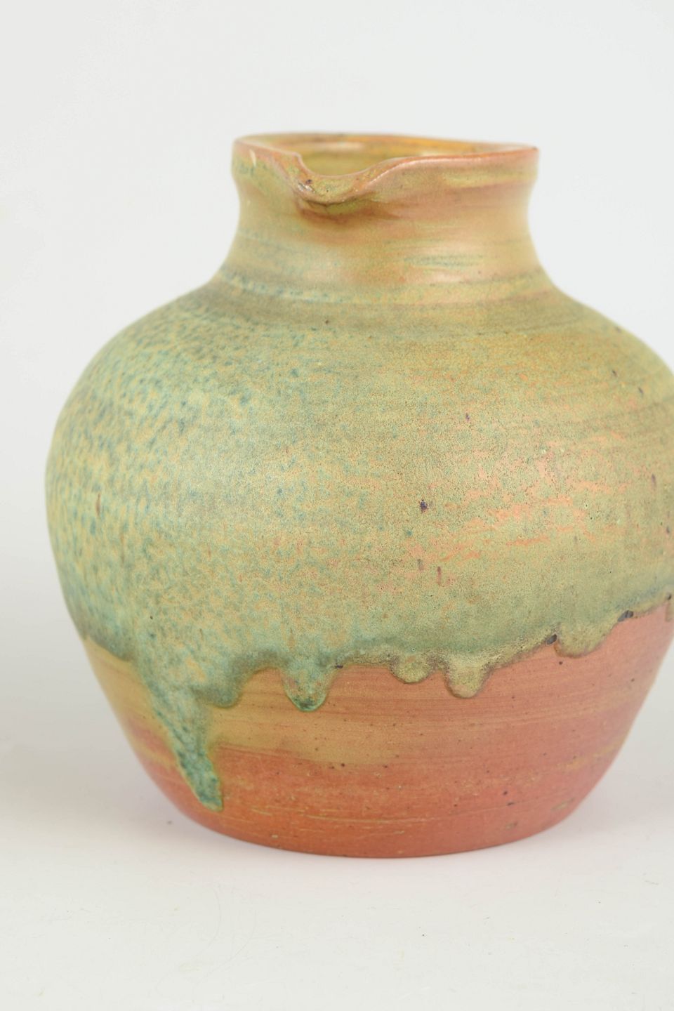 Compact, rounded jug in stoneware with a two-tone glaze, combining a greenish upper glaze with a warm terracotta-toned base. The soft transition between the glazes and the integrated handle create a calm and functional expression.