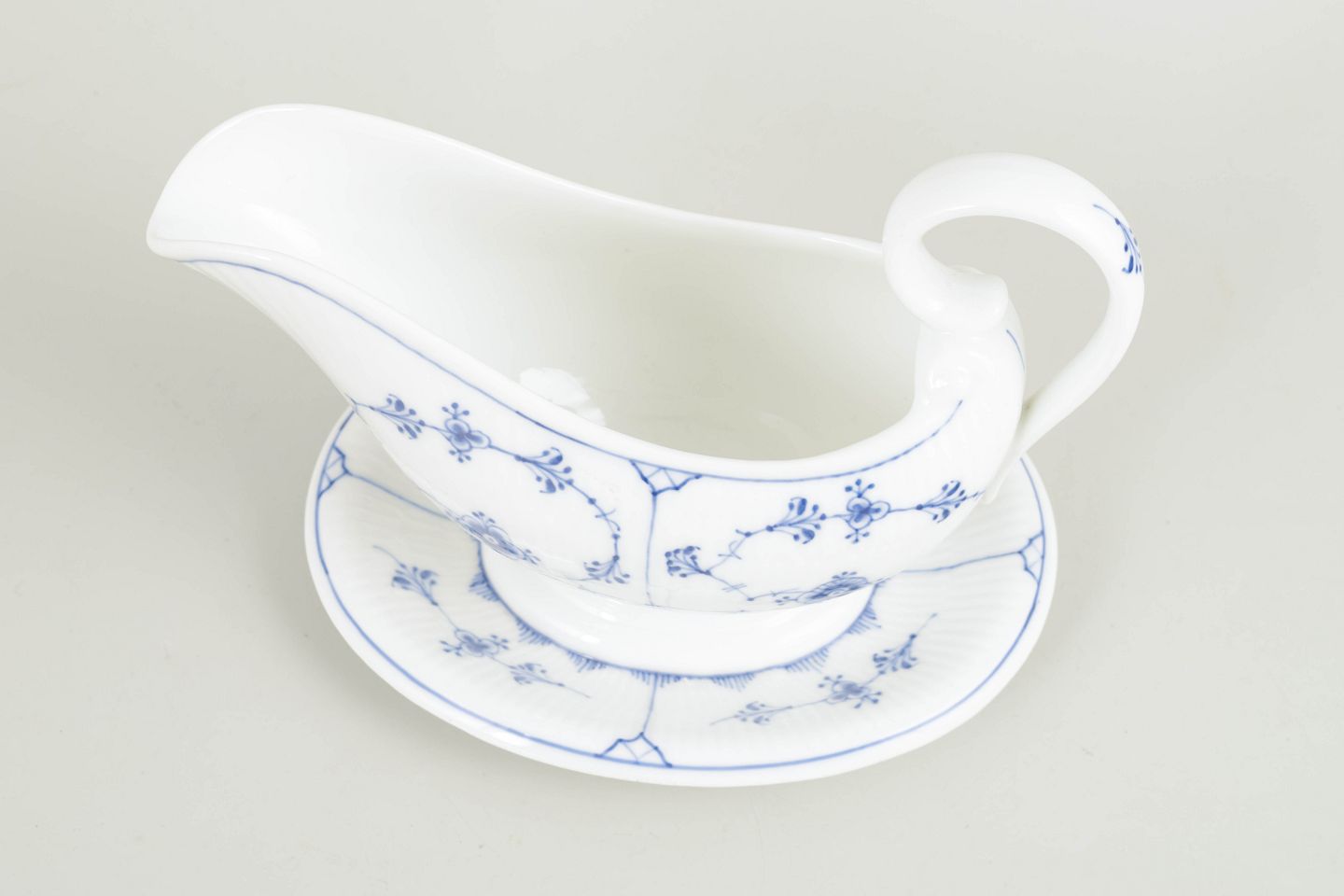 Blue Fluted Plain is Royal Copenhagen’s oldest pattern, introduced in 1775. The ribbed form combined with hand-painted underglaze decoration has for generations been a hallmark of Danish porcelain craftsmanship. Sauce boats of this type formed a natural part of the formal dining table around 1900 and exemplify the service’s functional elegance and timeless character.