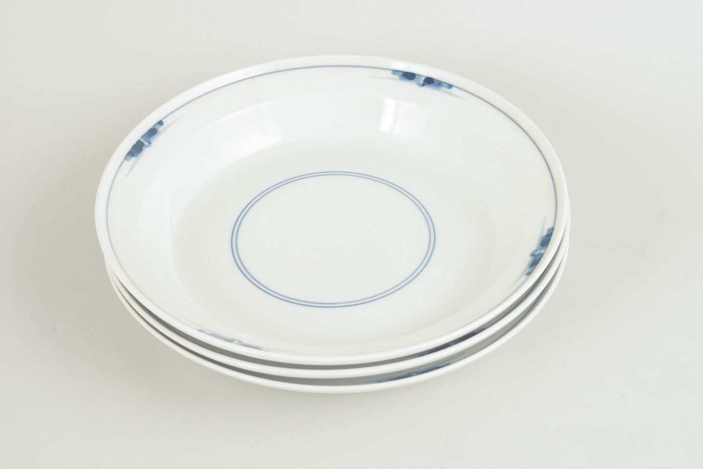 Set of three deep plates from the Gemina service, produced in white porcelain with a subtle, graphic blue underglaze decoration. The clean and modern design is characteristic of Royal Copenhagen’s production during the 1960s.