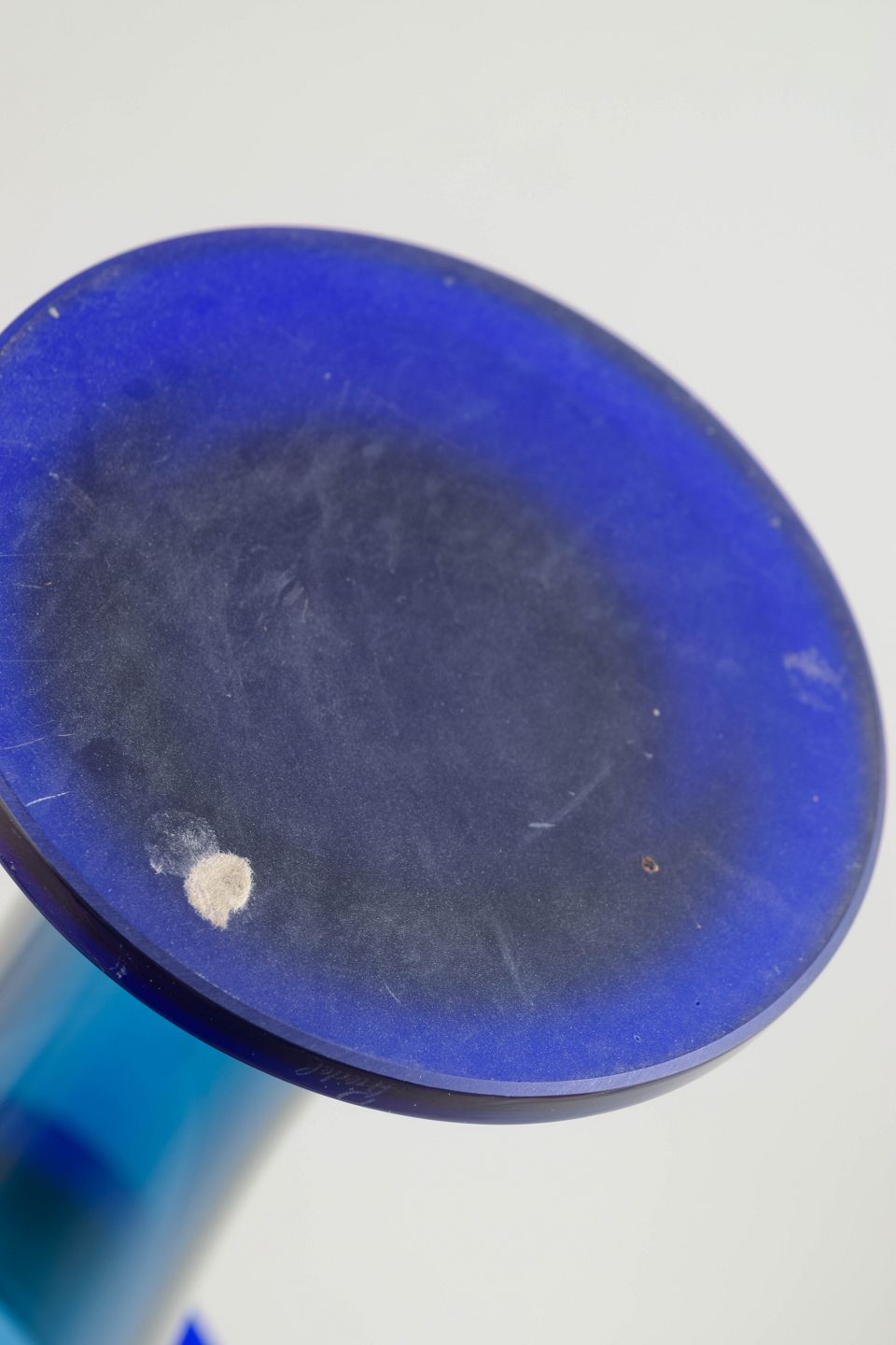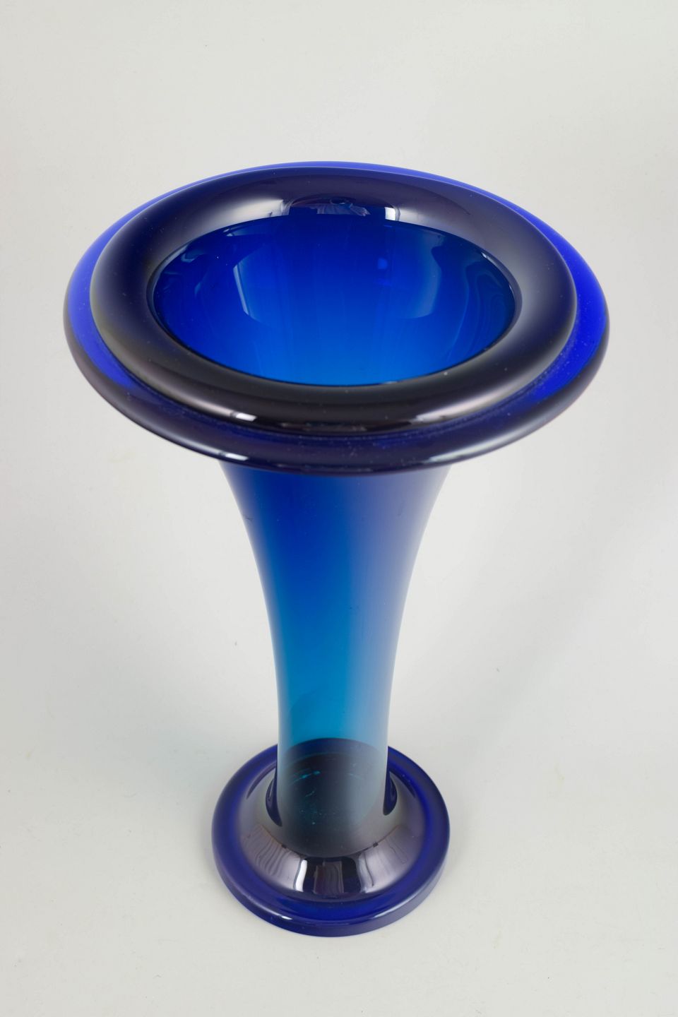 Elegant trumpet-shaped vase in mouth-blown, heavy crystal glass with a deep blue colour graduation. A striking example of Czech Art Deco glass with a solid foot and wide flared rim.