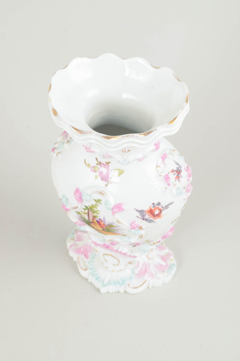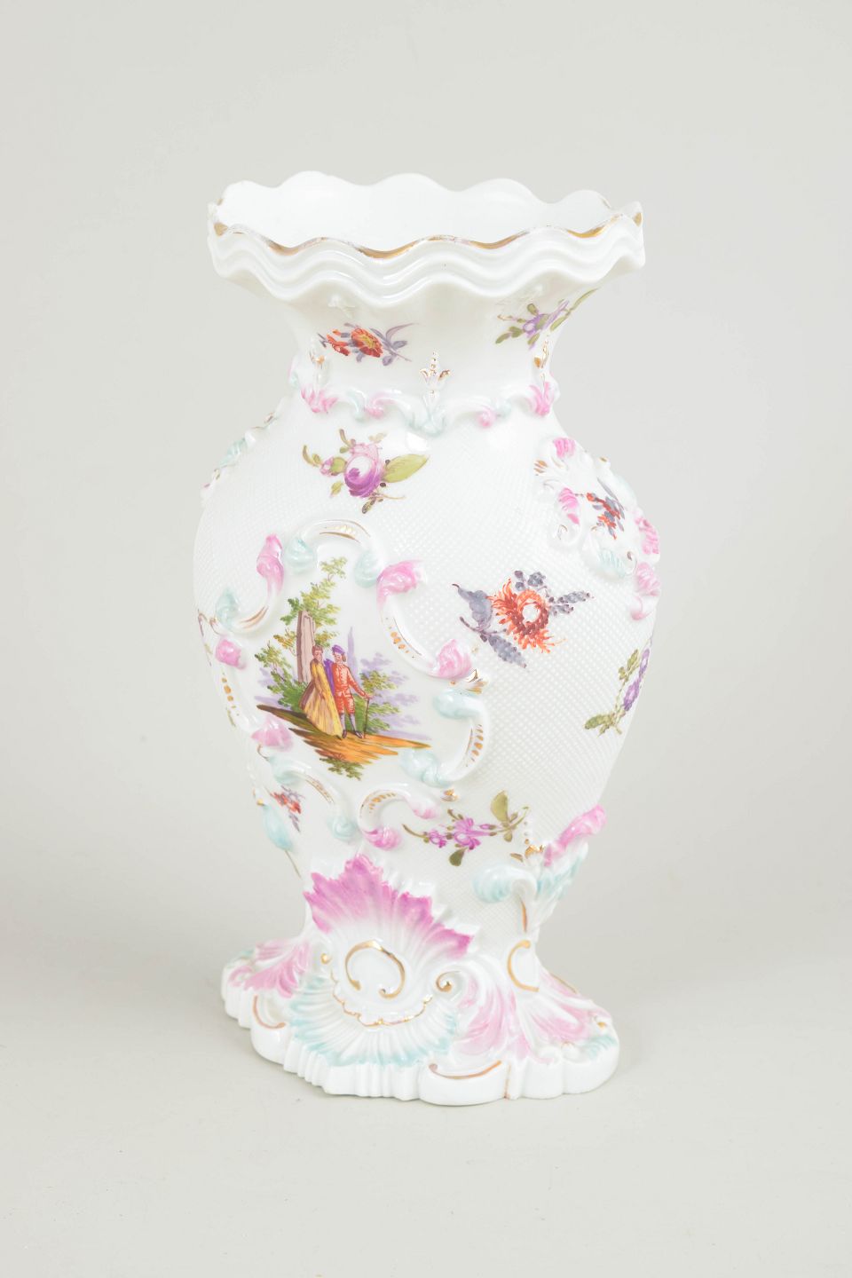 Rare porcelain vase with rich relief modelling and hand-painted polychrome floral and landscape decoration. Shaped foot and scalloped rim. A fine example of Meissen’s decorative porcelain production from the early 19th century.