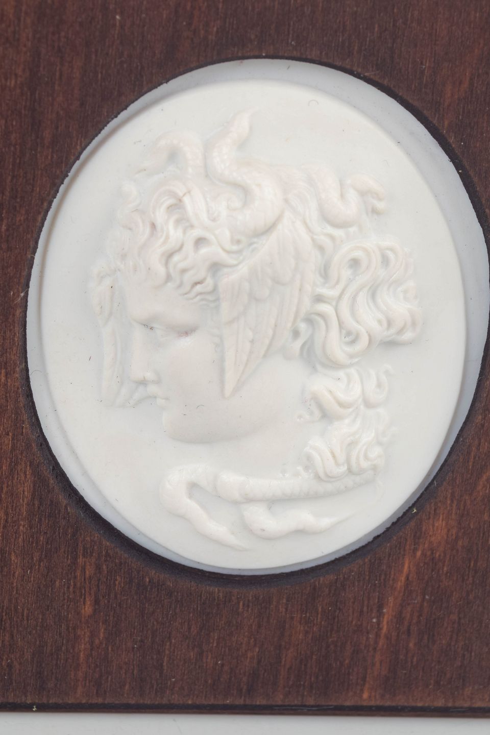 Small relief plaque in white biscuit porcelain with a classical profile portrait, mounted in a square wooden frame with an oval opening. The matte biscuit surface gives the motif a refined sculptural character and highlights the softly modelled facial features and hair.