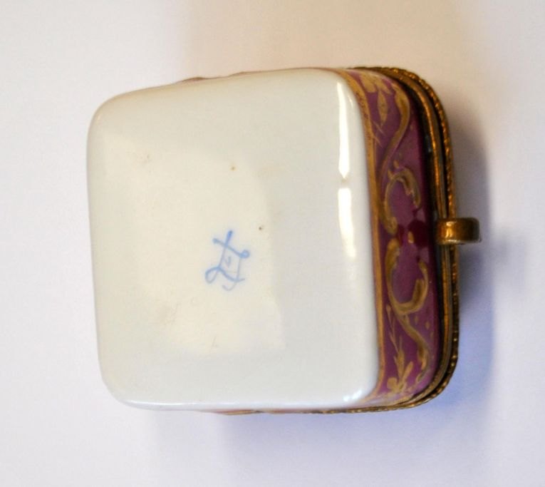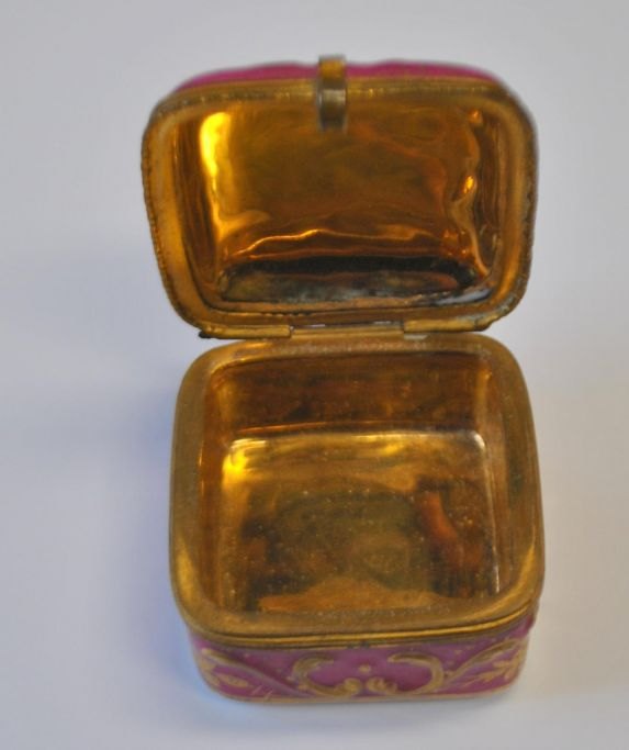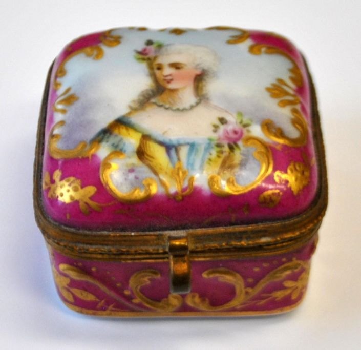 Sevres porcelain pill box, 19th century. France. Hand-painted porcelain with rococo woman. Light red with rococo gilding. Gilded inside. 4.5 x 4.5 x 3 cm. Perfect condition!