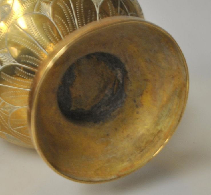 Indian brass vase with handle, circa 1950. With engraved decorations of a seated prince and flowers. H.: 21 cm.