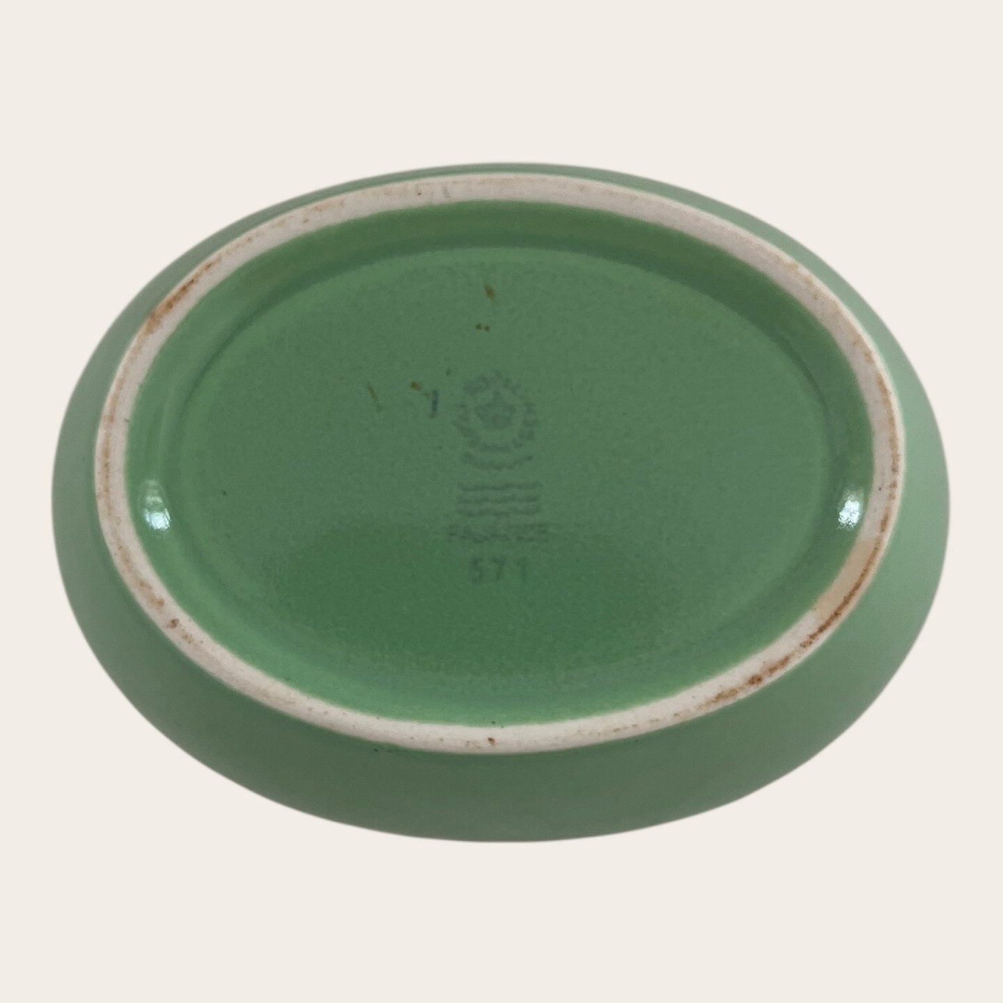 Royal Copenhagen, Aluminia, Ursula, Oval bowl, Green #571, 1st grade, 10.5cm long, 8cm wide, 6cm high, Design Ursula Munch Petersen *Good condition*