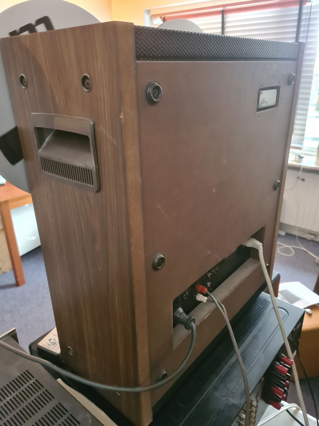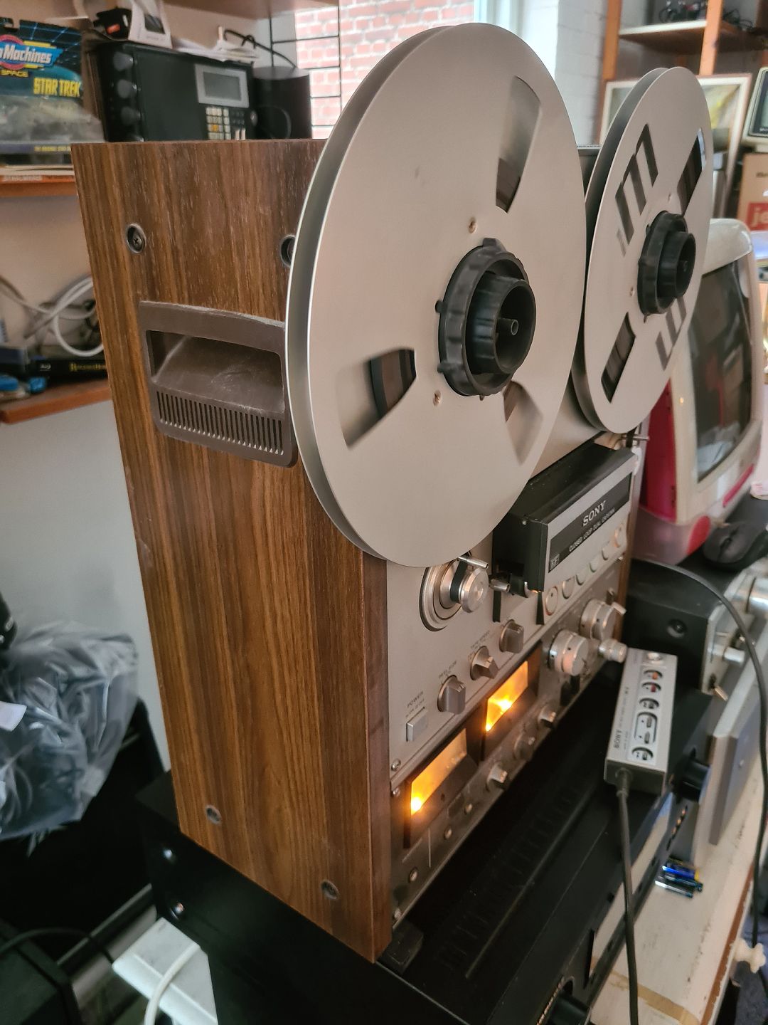 Text available in Danish: Spolebåndoptager fra Sony model TC-765. Fremstillet i 1979 og virker fint. Den kunne nok godt bruge en anelse service for at fremstå optimalt. NB svagt indridset på fronten. (Billede) Fjernbetjening model medfølger GM-30 medfølger. Den er ligeledes testet : Rewind virker ikke. Pause sporadisk og resten virker fint.