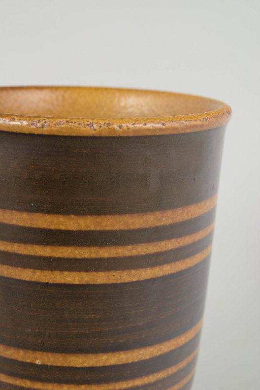 Decorative faience vase with hand-painted, stylised decoration, characteristic of Britt-Louise Sundell’s work for Gustavsberg during the 1960s. The form is restrained and well balanced, with an emphasis on surface decoration and colour typical of Swedish mid-century modern design.
