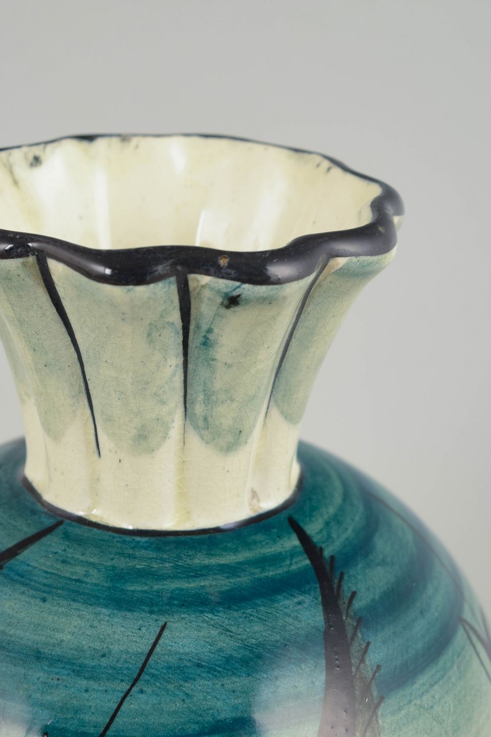Art Deco faience vase with a well-balanced, rounded body and a slender neck with a softly undulating rim. Decorated in characteristic blue-green tones with stylised plant motifs and fine brushwork, executed in the distinctive “Löja” decoration developed during the 1930s. The model is a clear example of Swedish Art Deco, combining natural inspiration with graphic ornamentation.