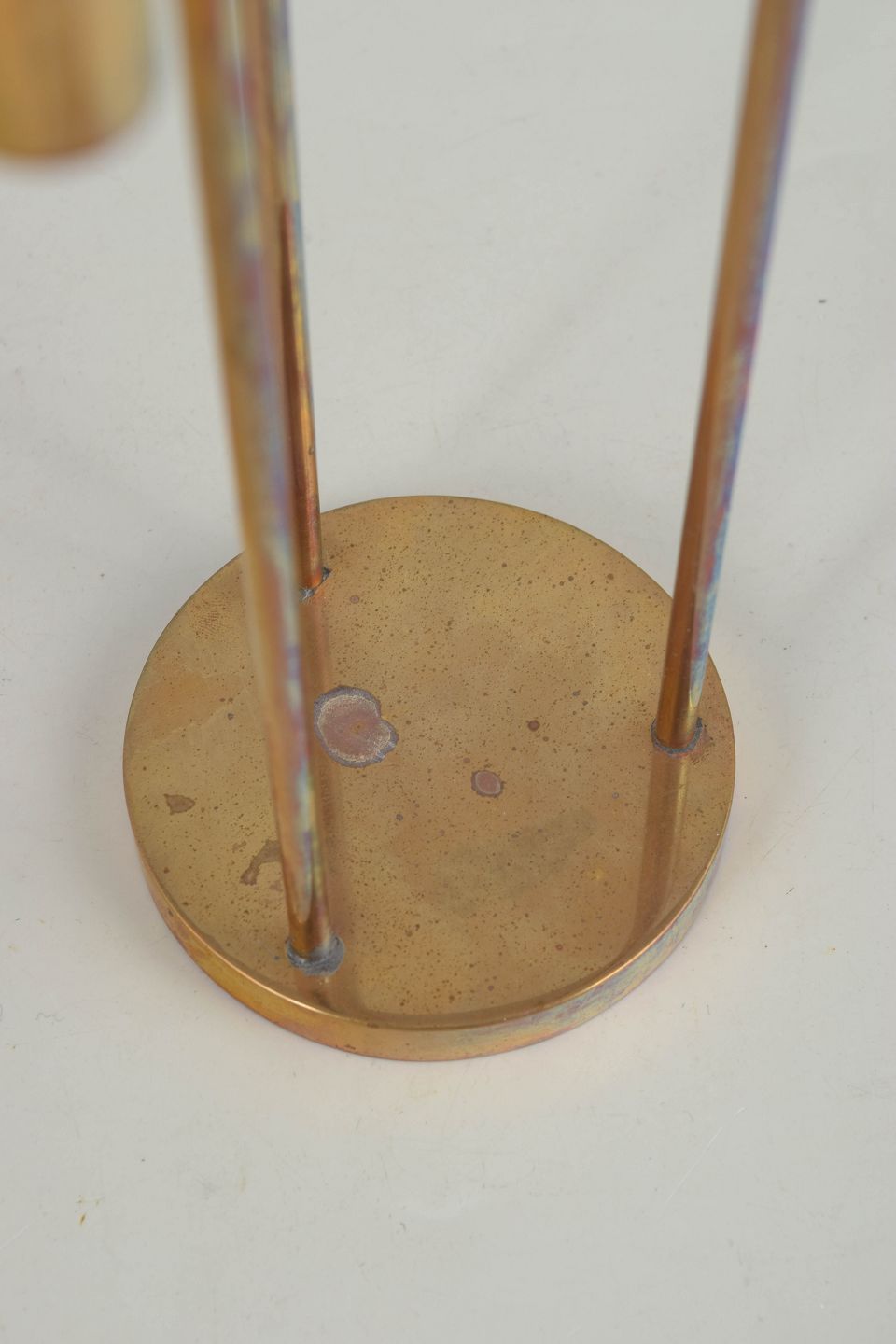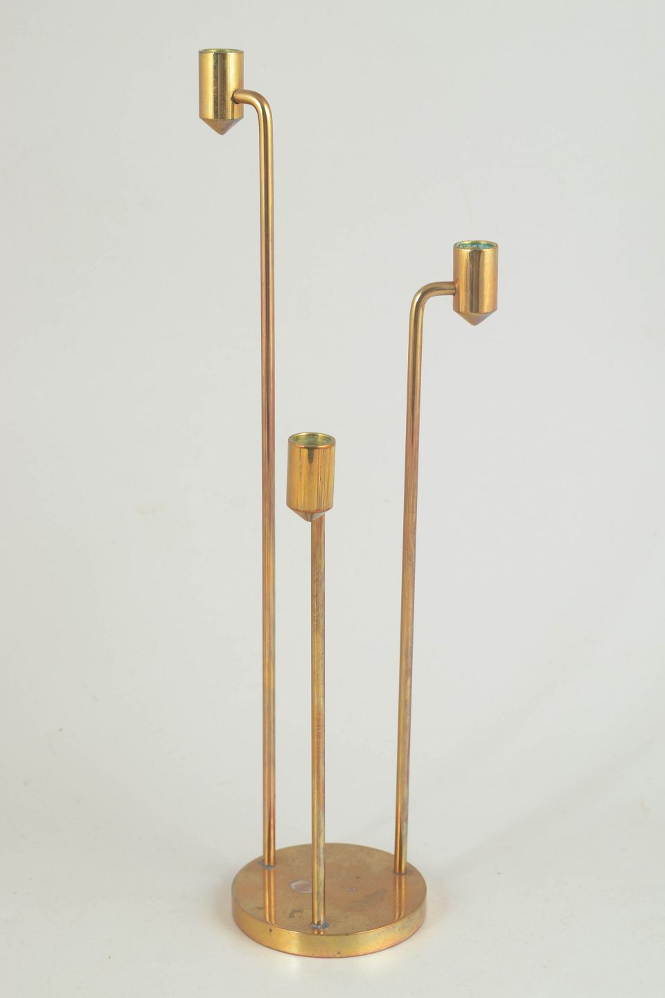 Sculptural three-armed candlestick in solid brass with slender vertical arms of varying heights. A restrained and elegant modernist design, firmly rooted in Scandinavian aesthetics of the 1960s.