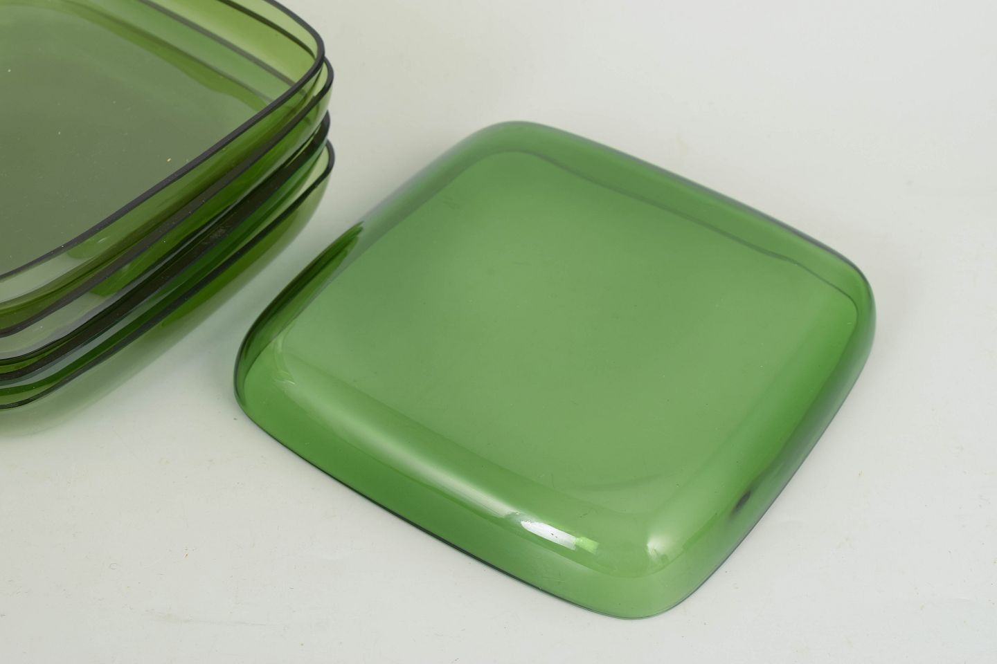 Set comprising five handmade green art glass plates with softly rounded corners and a gently raised rim. A restrained and functional design with a clear Scandinavian modernist expression.