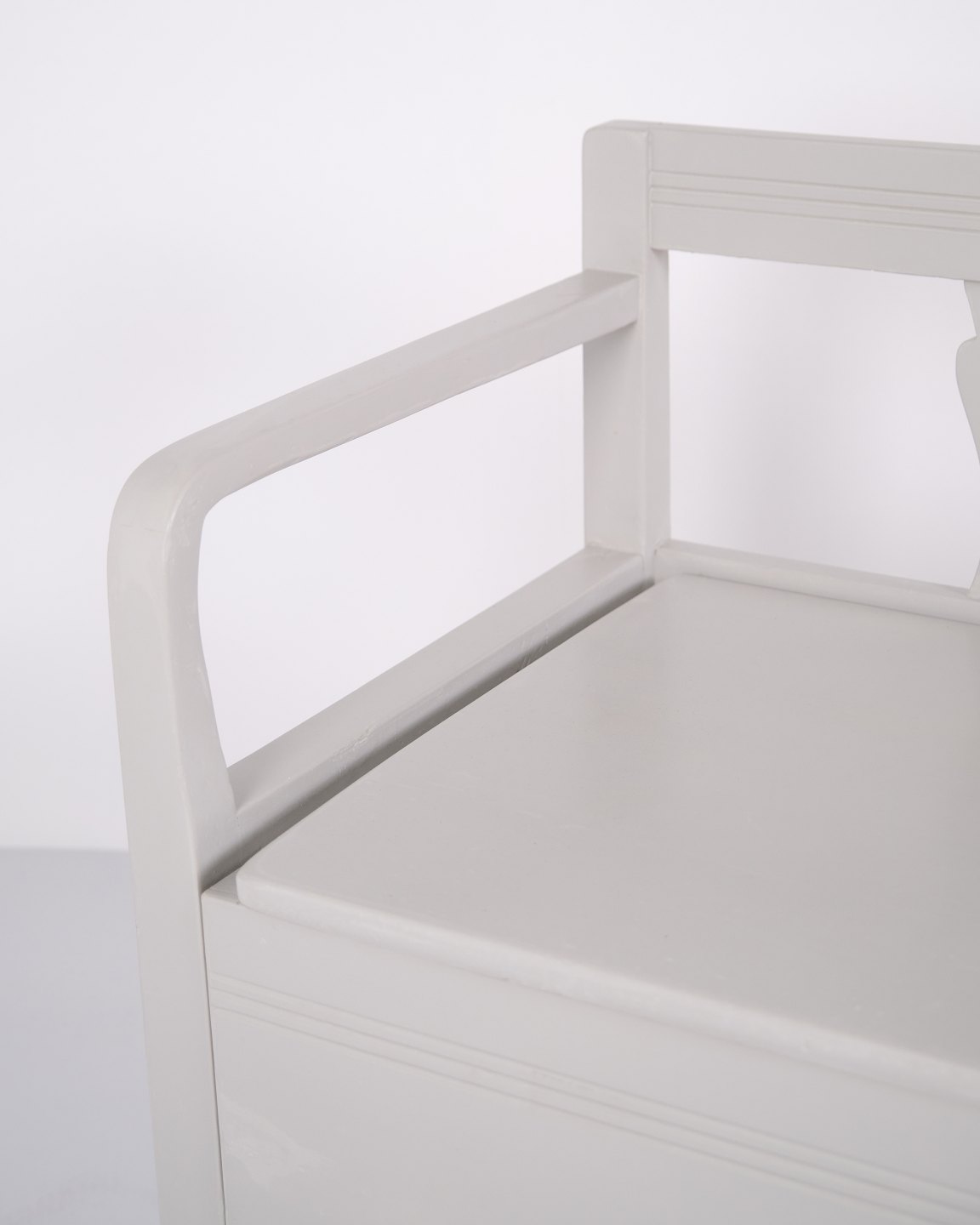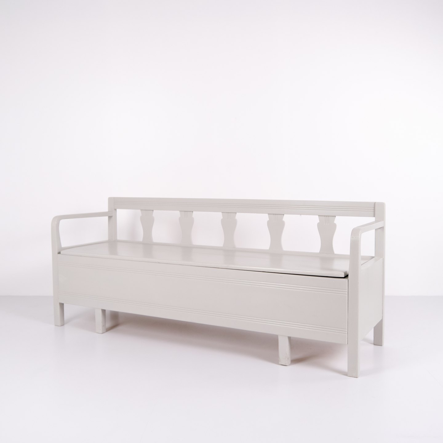 Antique beater bench from the 1860s in gray painted pine. Classic folk design with seating and storage. Historical and functional furniture.