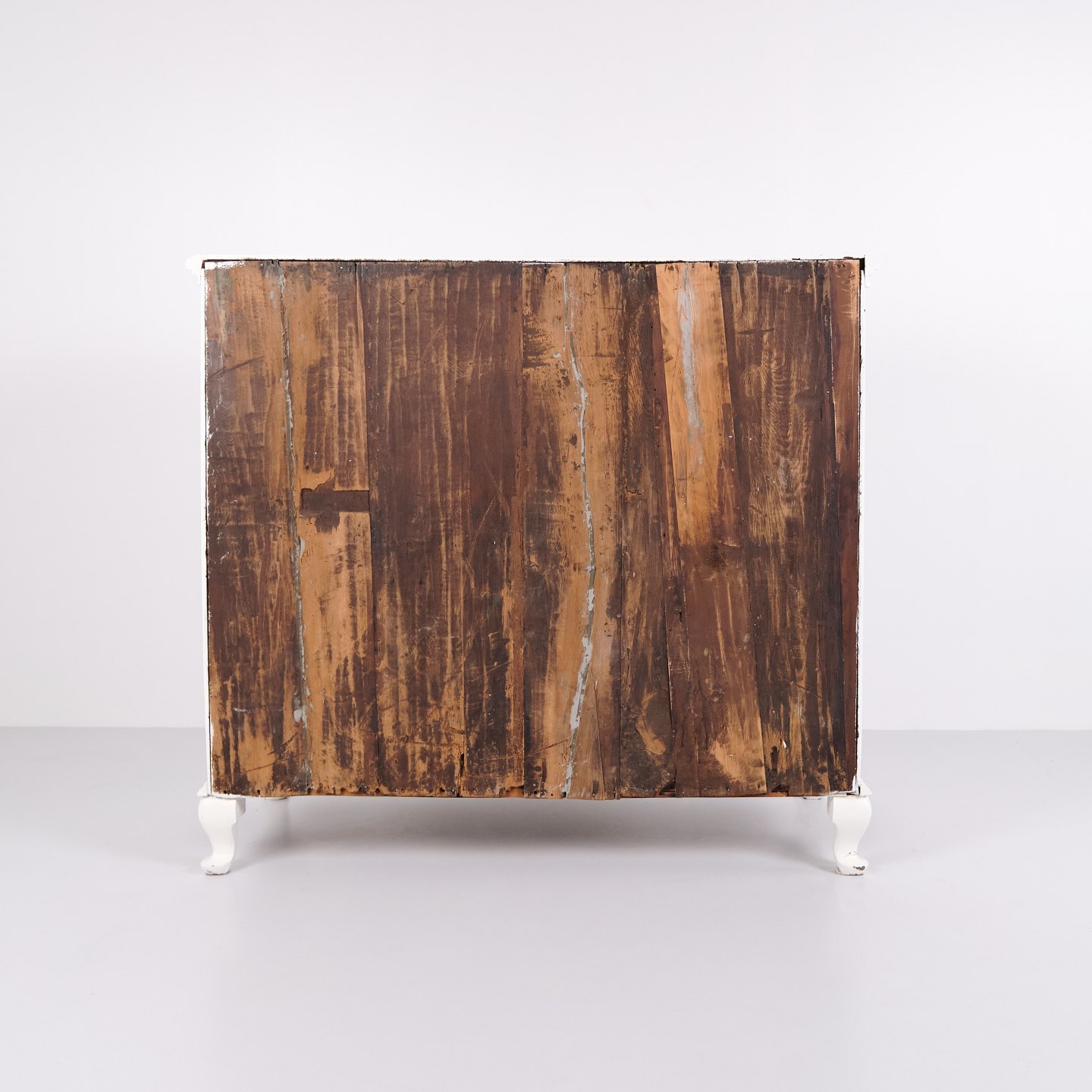 Antique baroque chest of drawers from the 1760s, painted white with brass handles. Four drawers and a distinctive baroque design. Historical and decorative piece of furniture.