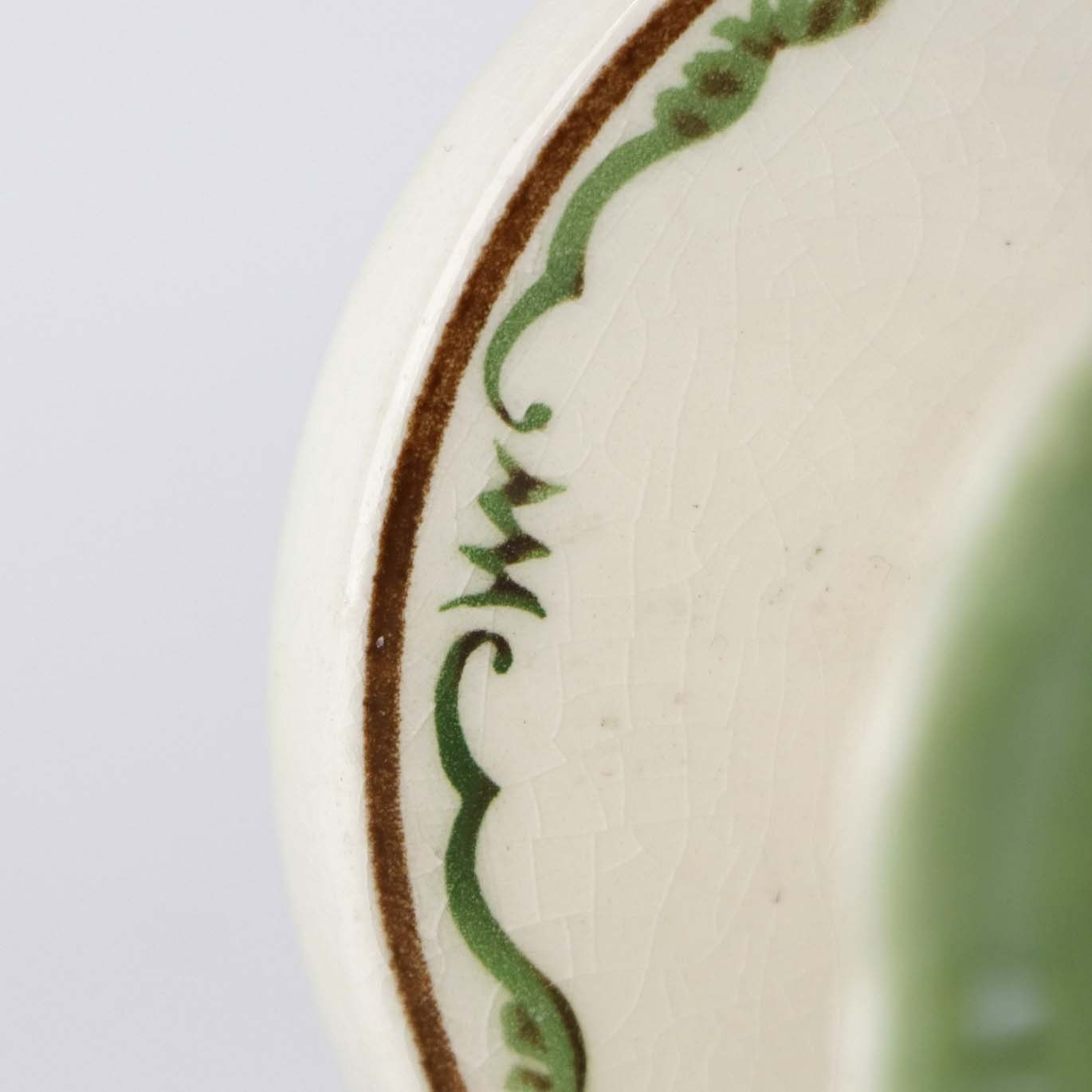 Fajancestel i stelform G med dekoration af orangegule blomster og grønne guirlander på lys baggrund med brun kant.