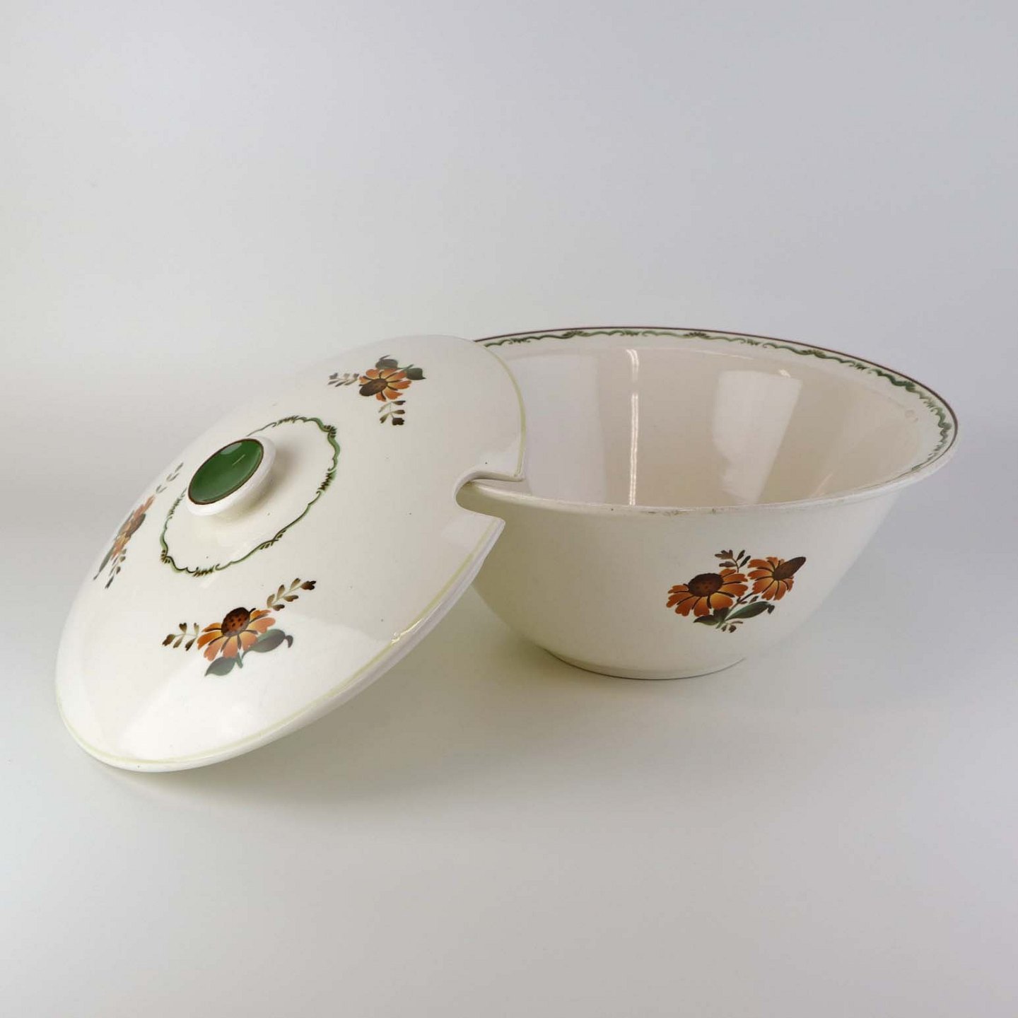 Fajancestel i stelform G med dekoration af orangegule blomster og grønne guirlander på lys baggrund med brun kant.
