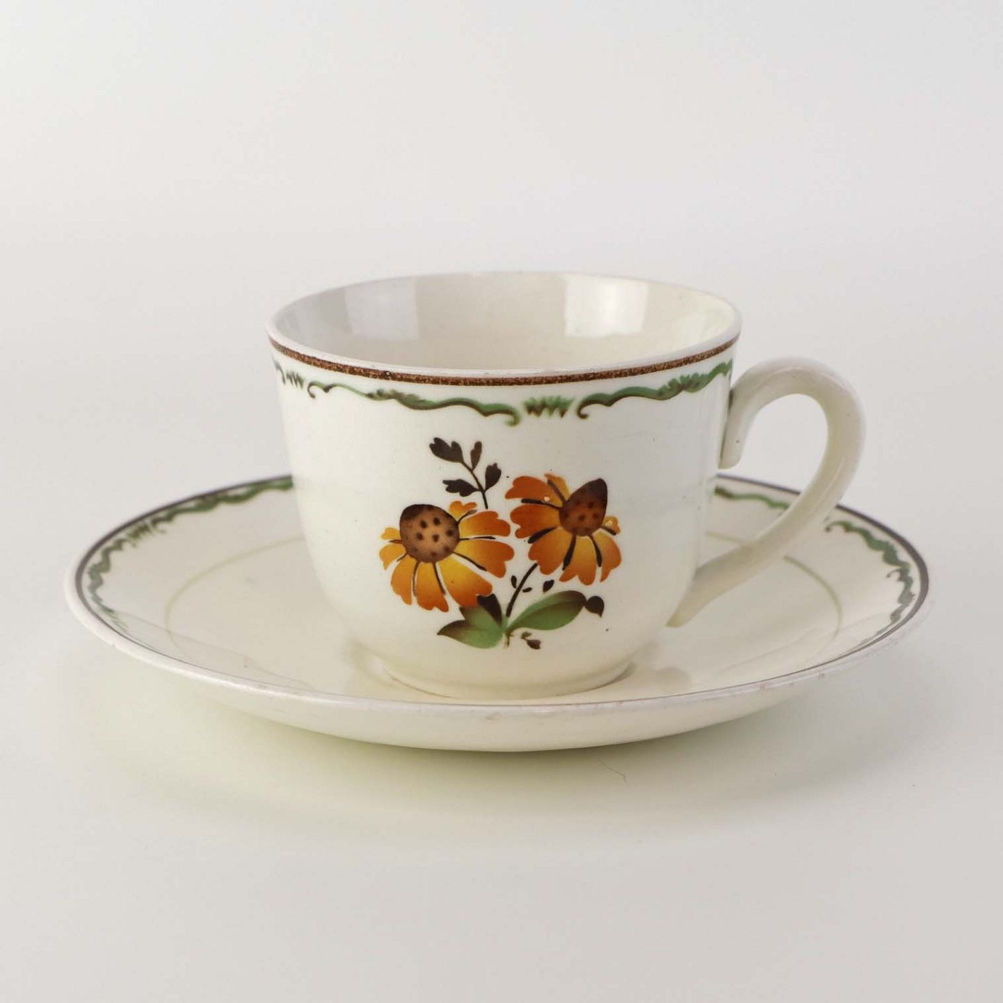 Kaffekop med underkop i fajance fra stellet Solbrud fremstillet i perioden 1937-1967. Nr. 2049