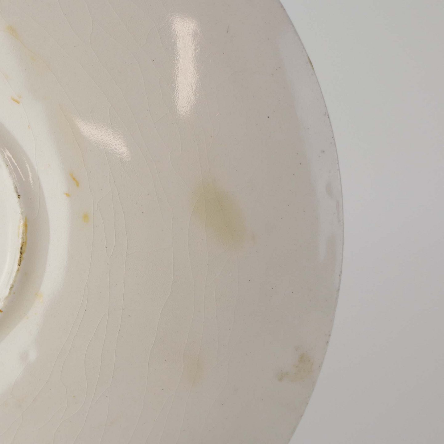 Fremstår med brugsspor på dekorationen, sorter nister og klakkeleringer i glasuren samt enkelte steder med bruneringer under glasuren på underkoppens bagside.