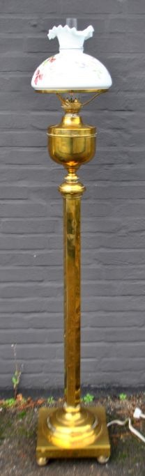 Stander kerosene lamp, approx. 1900. Brass. Converted to electric. With large white glass dome with enamel decorations of flowers. H.: 153 cm. Dia. shade: 27 cm.
