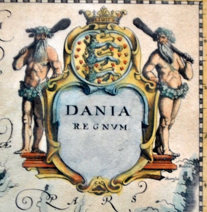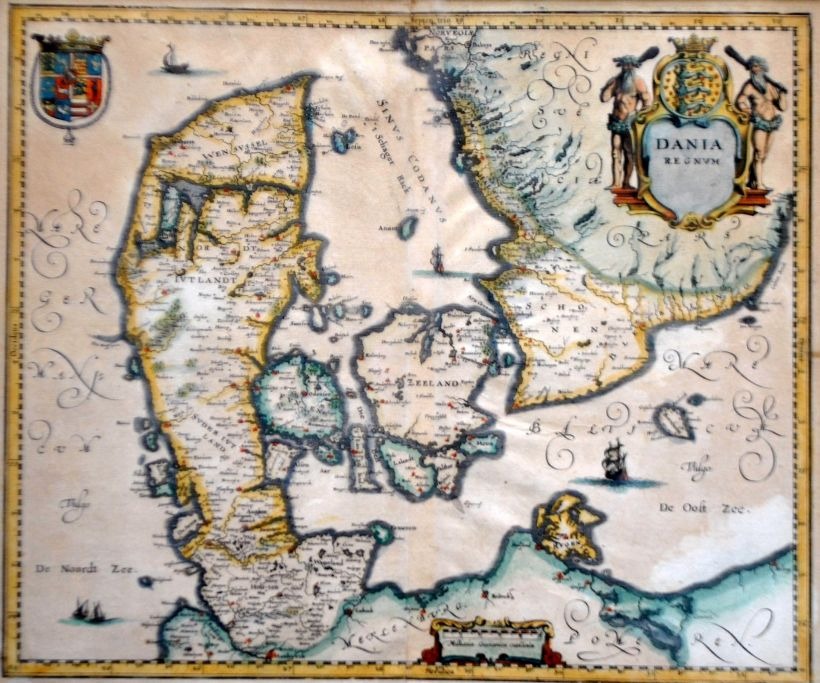 Willem Janszoon Blau (1571 - 1638) Netherlands: General map of Denmark. 1634. Copperplate engraving, hand-colored. Unsigned. 28 x 33 cm.