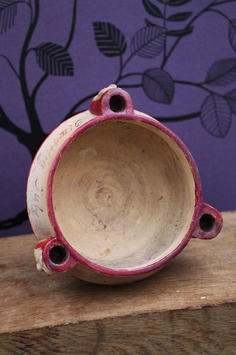 Old Christmas bowl in terracotta decorated with 3 small elf heads where there is room for small Christmas candles.