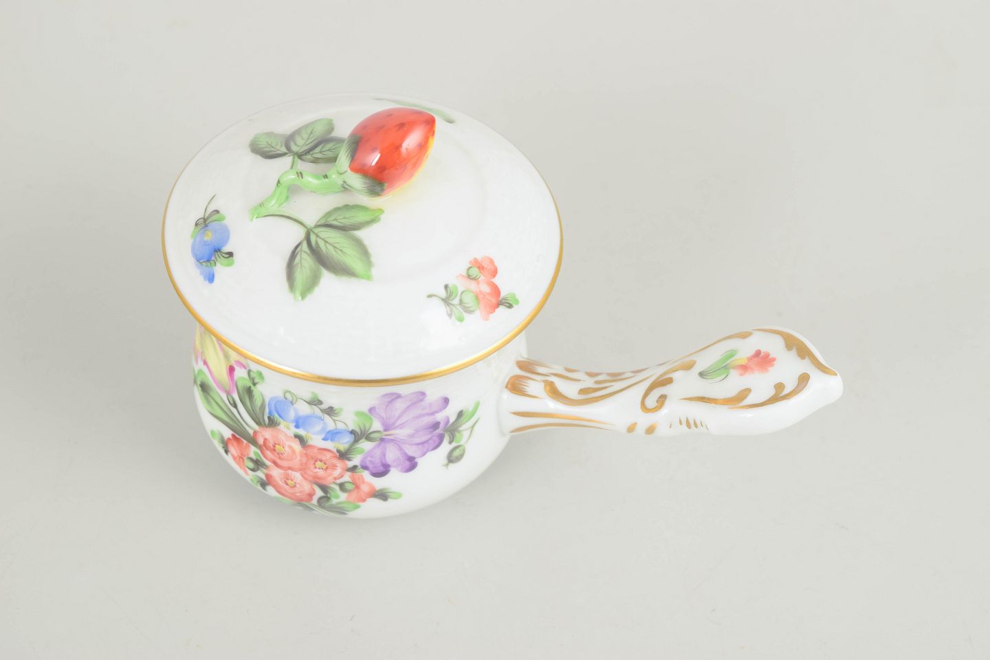 Hand-painted bouillon cup in glazed porcelain with floral decoration in pink, purple, blue and green tones. Rounded body with a gently curved handle, lid with bud-shaped finial, and subtle gilt detailing along the rim and accents.