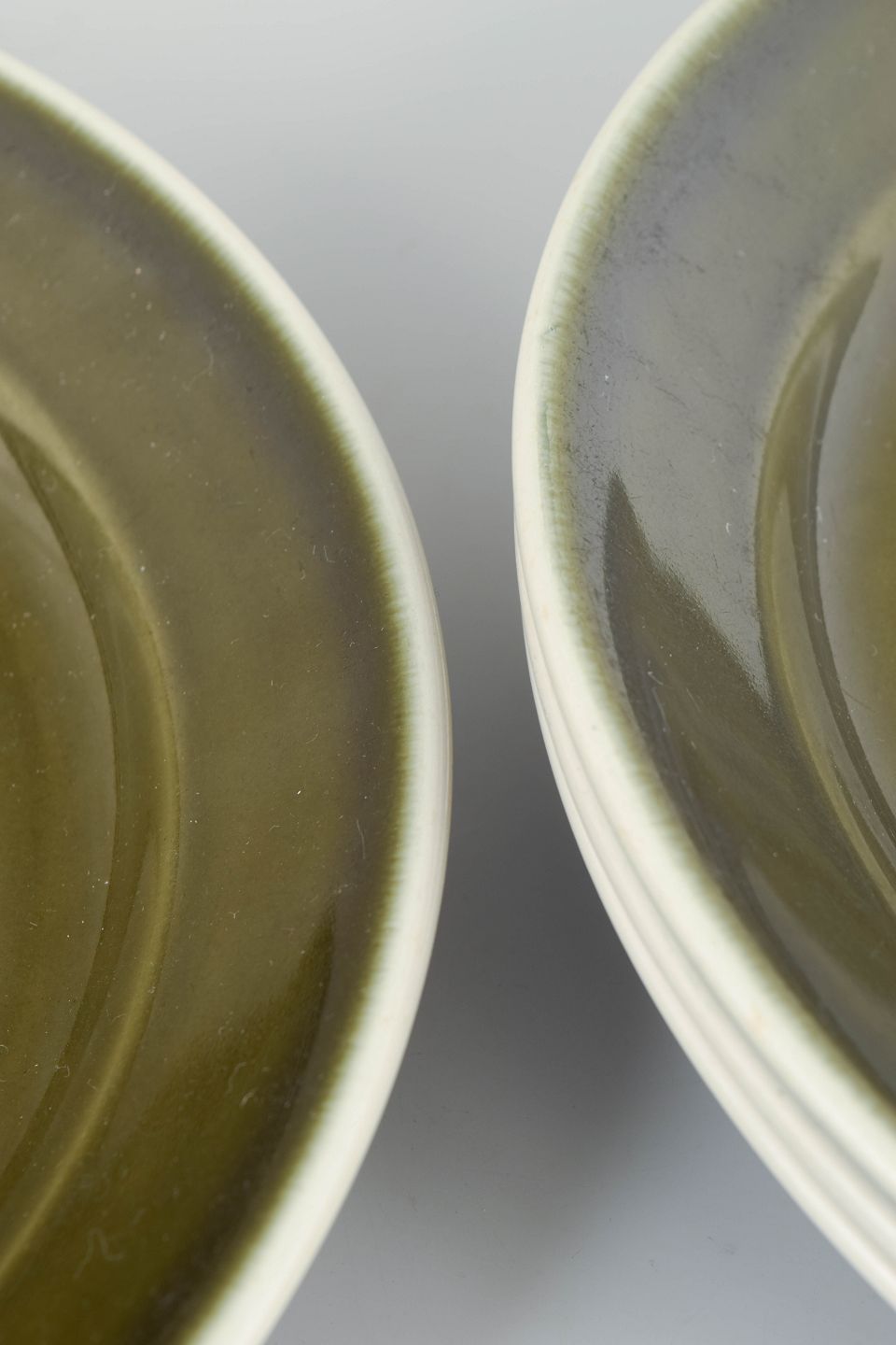 Set of four dinner plates in glazed stoneware from the "Vardag" series. The plates feature a simple, functional design with a wide rim and deep centre, finished in a characteristic green glaze with dark edging, typical of Stig Lindberg’s everyday tableware from the 1970s.