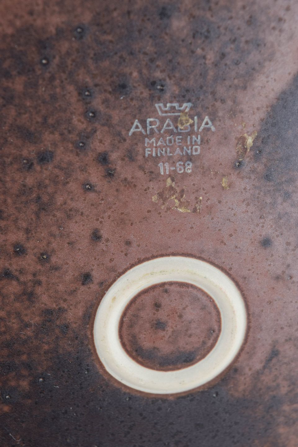 Flat stoneware dish by Arabia from the Ruska series, finished in the distinctive mottled brown glaze in warm earth tones. Classic circular form with a gently raised rim and a lively glaze surface, where natural variations give each piece an individual appearance. Model from the Ruska series.