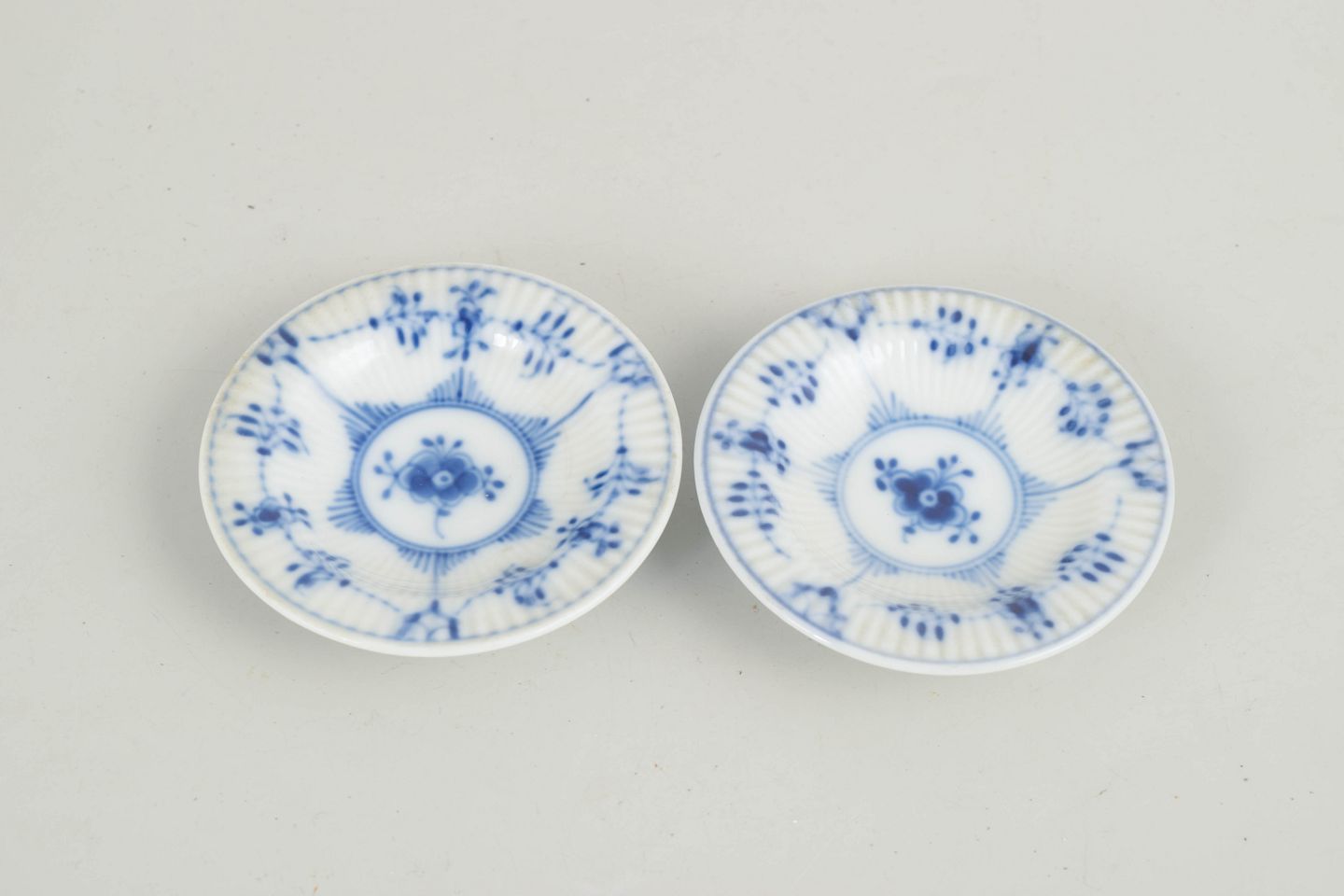Set of two small fluted dishes in glazed porcelain with hand-painted cobalt-blue underglaze decoration. Low, rounded form with a slightly raised foot. Model 1/7.
