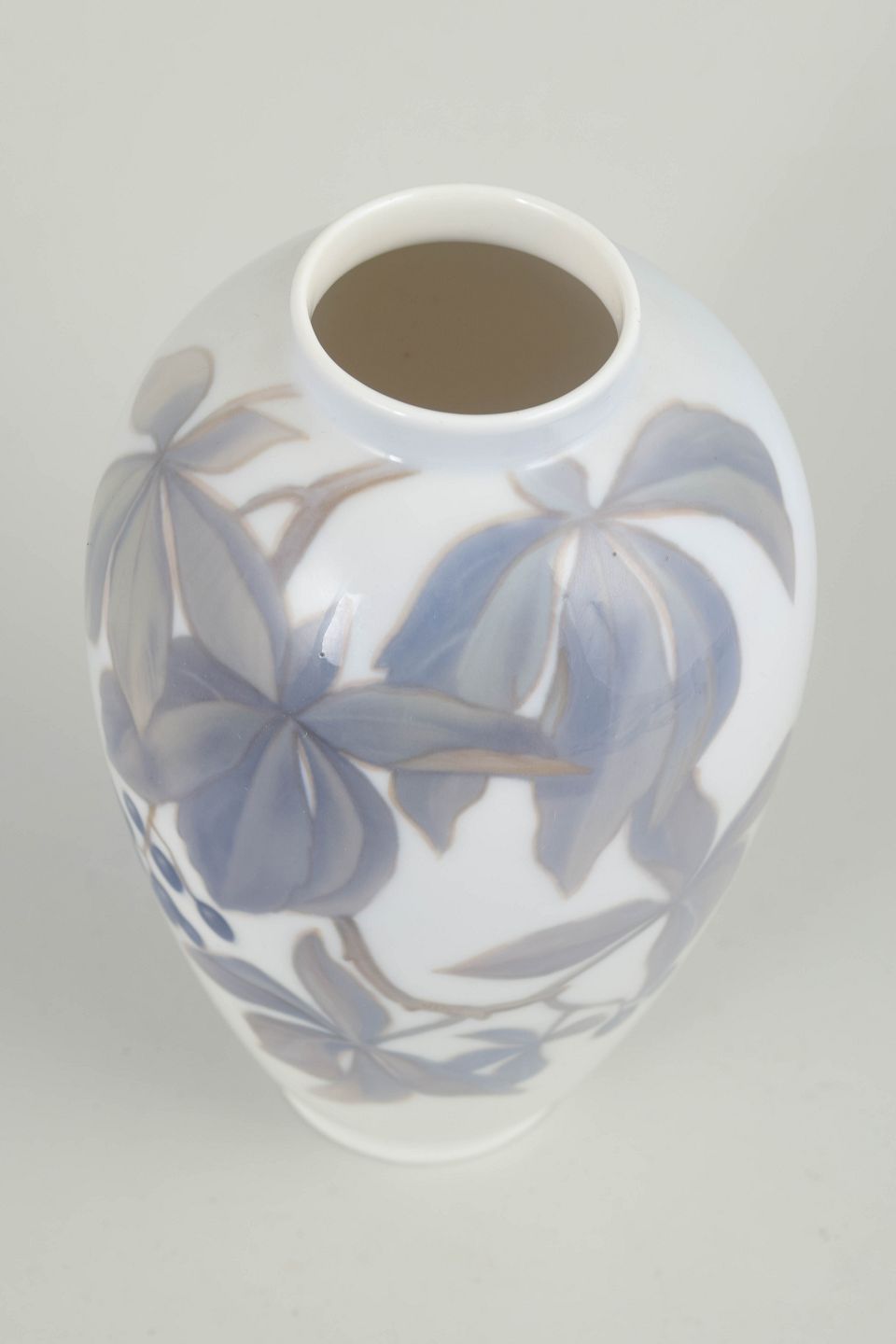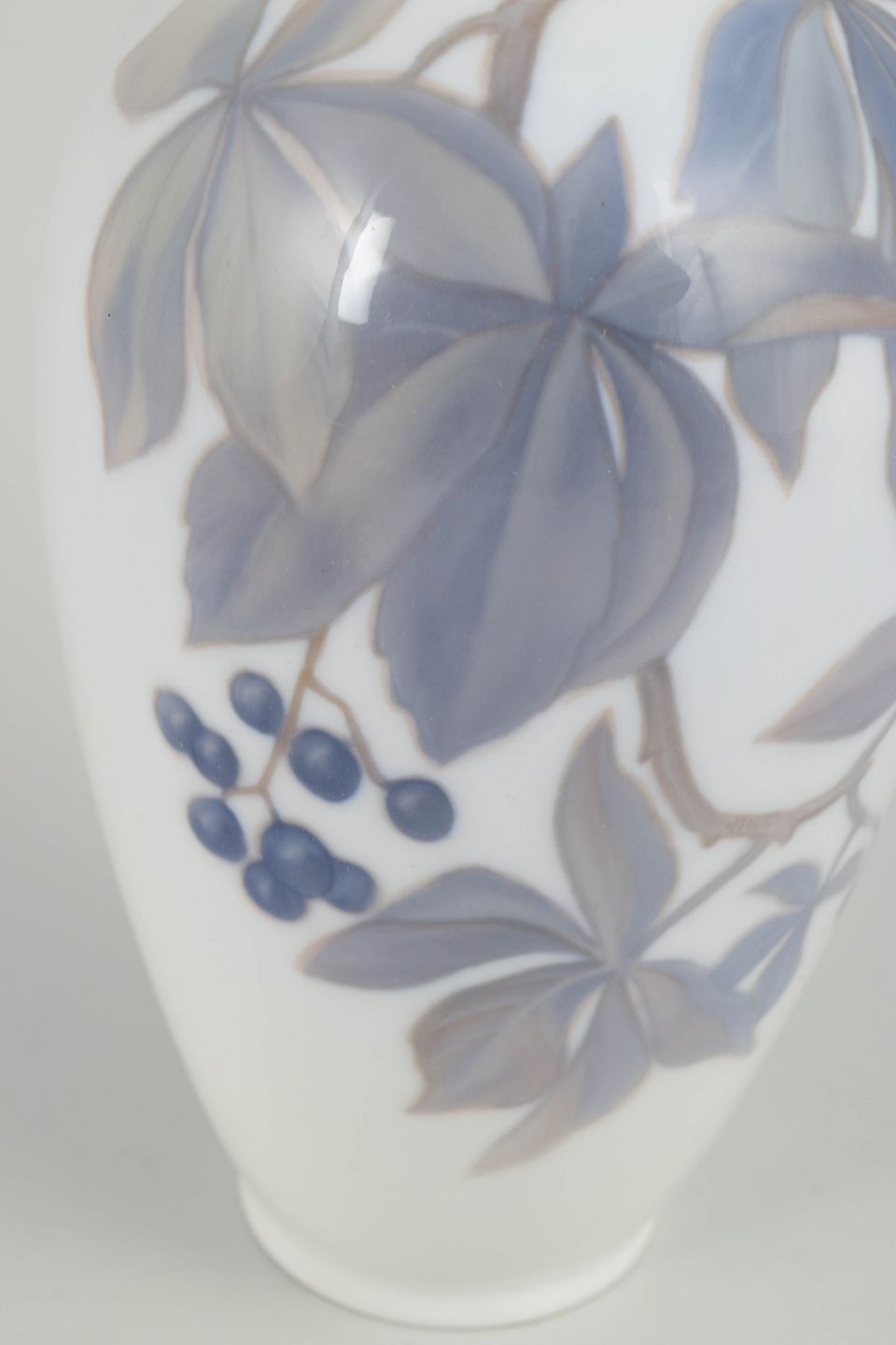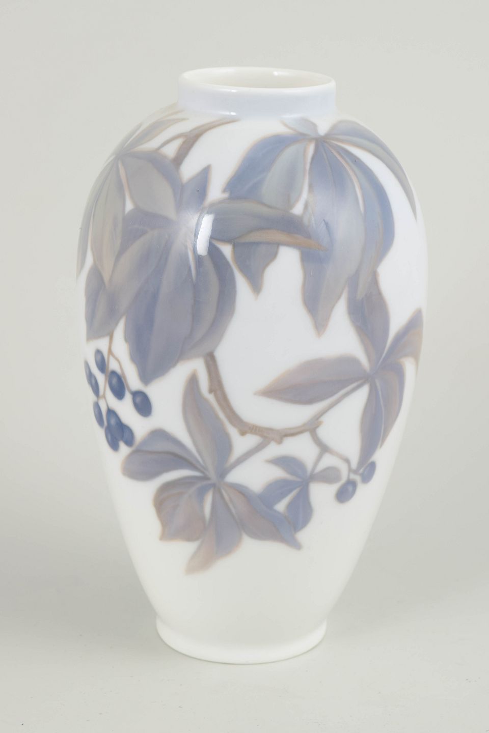 Slender baluster-shaped porcelain vase with a hand-painted underglaze decoration of stylised leaves and berries in muted blue-grey and brownish tones on a white ground. The decoration follows the form of the vase with a light, flowing rhythm. Model 1218, decoration 44c, dating from the 1920s.