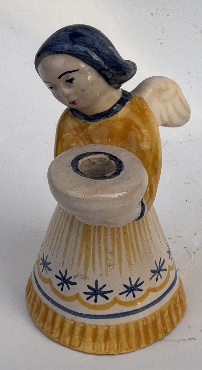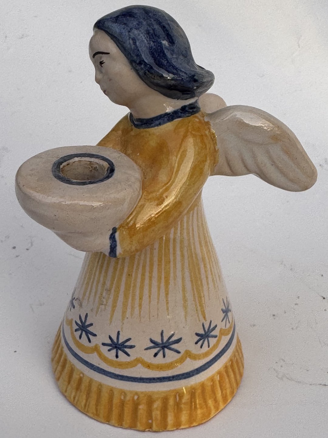 ANGEL IN A YELLOW DRESS: Figure of a painted angel in ceramic as a candle holder from the Bornholm pottery factory Lauritz Hjorth. Appears in good condition without damage or repairs. Factory mark on the bottom. H. 9.5 cm