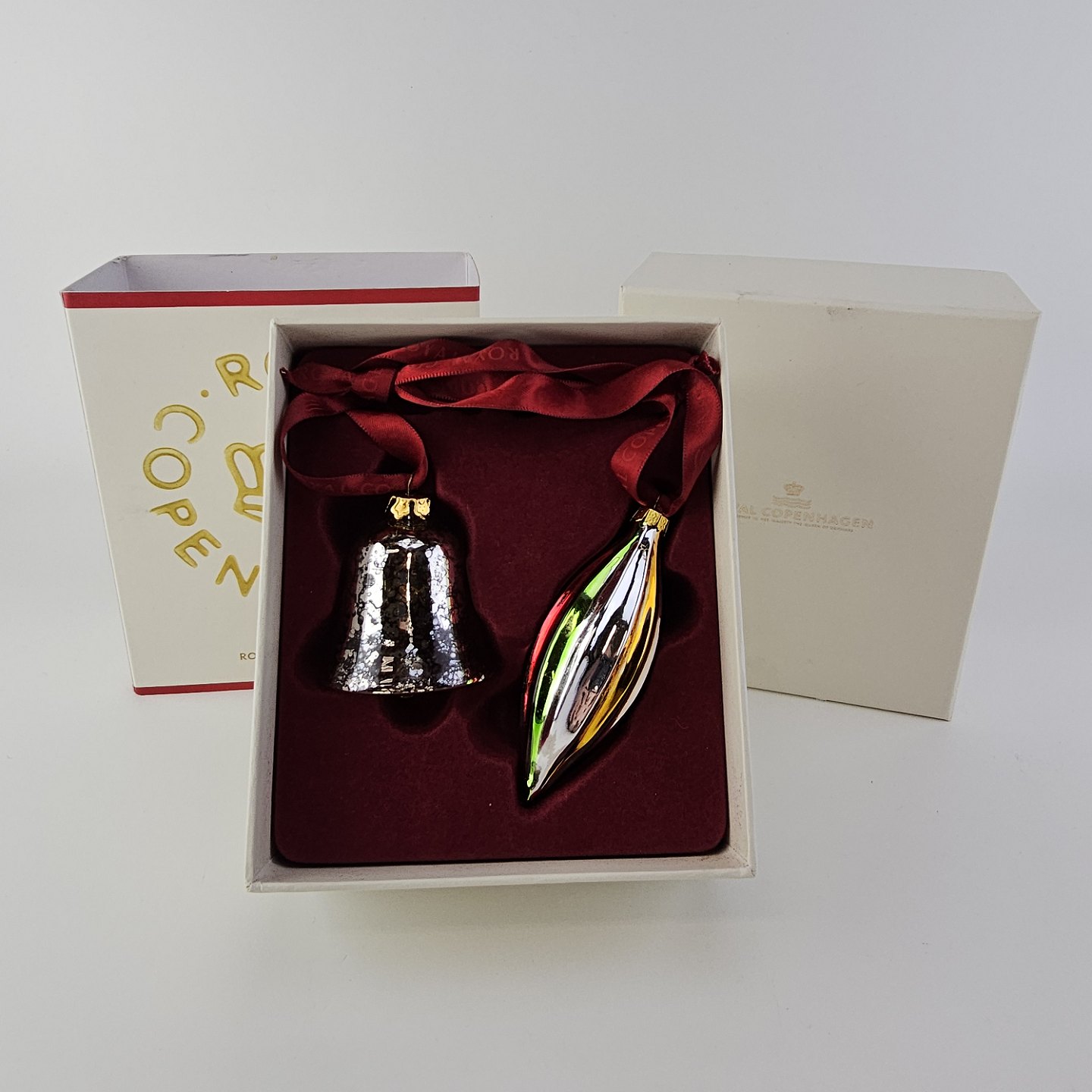 Juleornamenter i glas med motiv af en klokke og en aflang julekugle med rødt bånd til ophæng