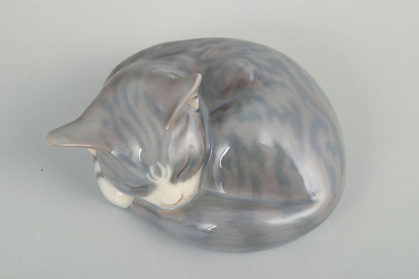 Porcelain figurine depicting a curled, sleeping cat, modelled with soft lines and finished in a subtle grey and white glaze with delicate tonal variations. Model 422.