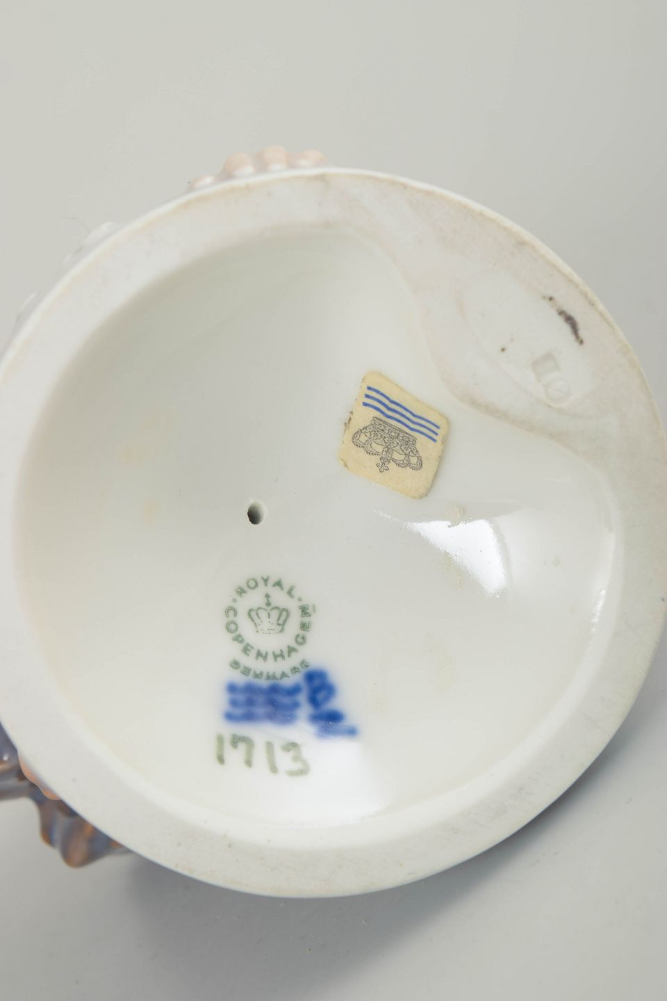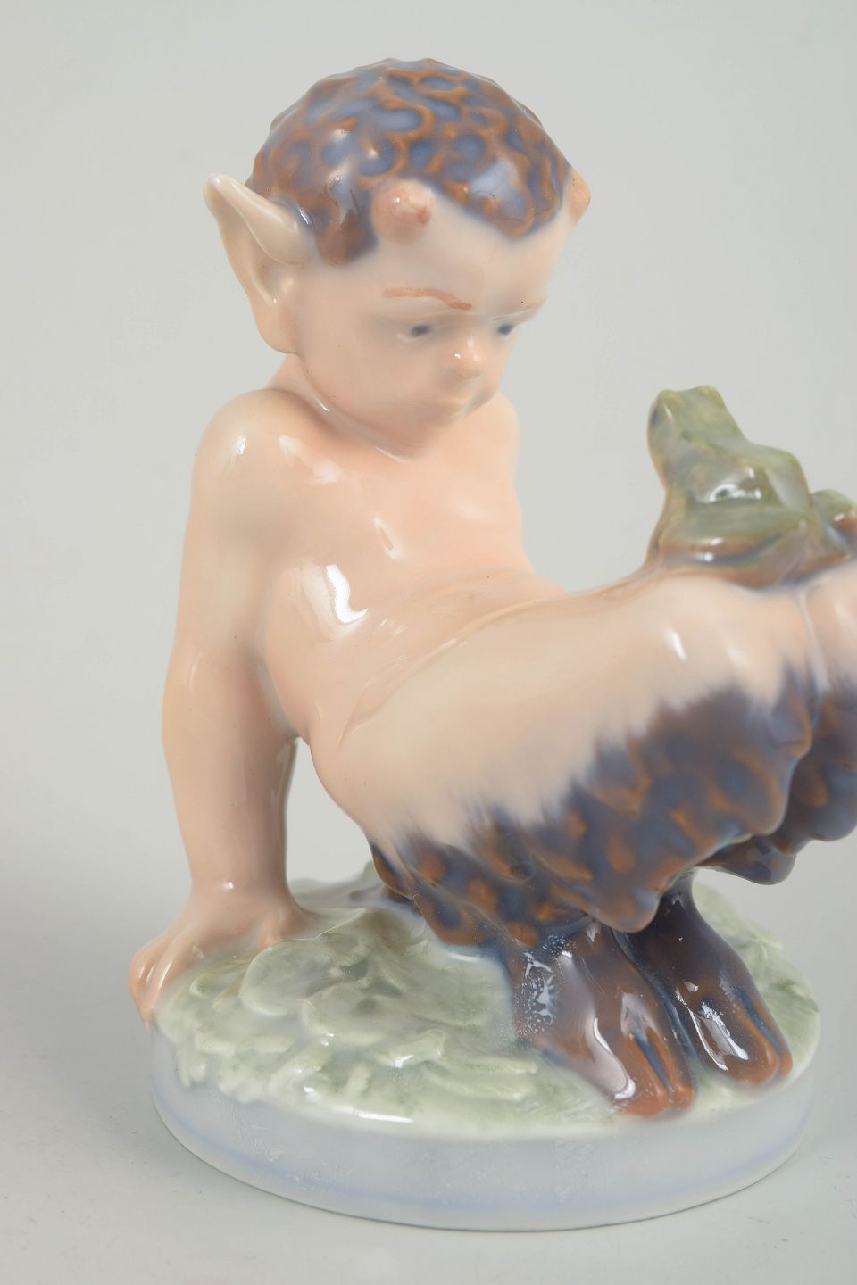 Porcelain figurine depicting a faun and frog seated on a base, modelled with soft, naturalistic forms and subtle pastel colouring. Model 1713.