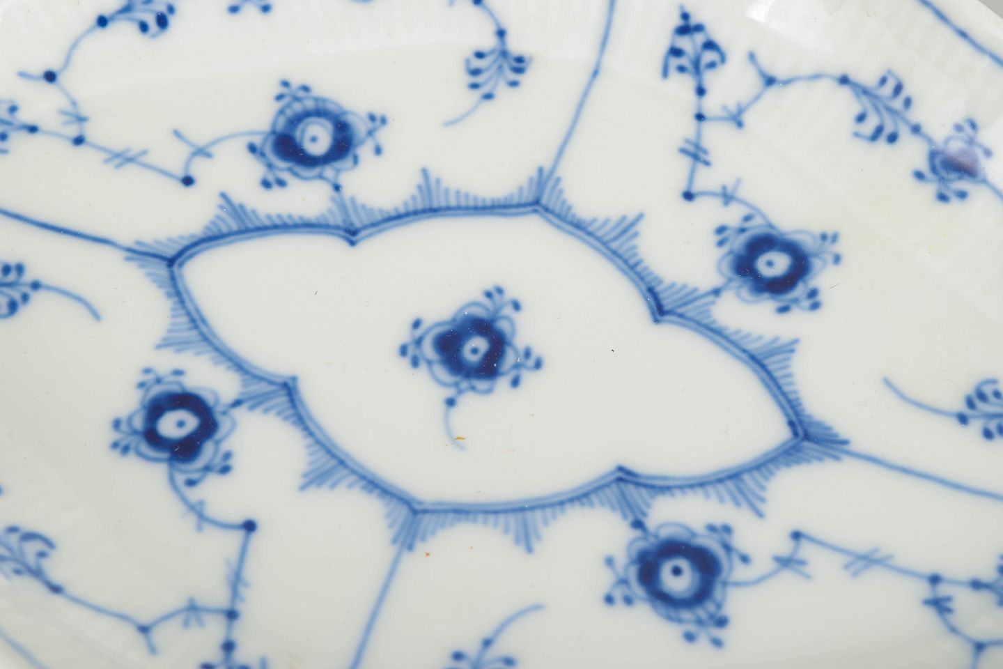 Oval dish in glazed porcelain with hand-painted underglaze decoration in the classic Blue Fluted Plain pattern. Model 1/147.