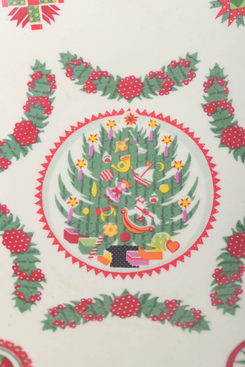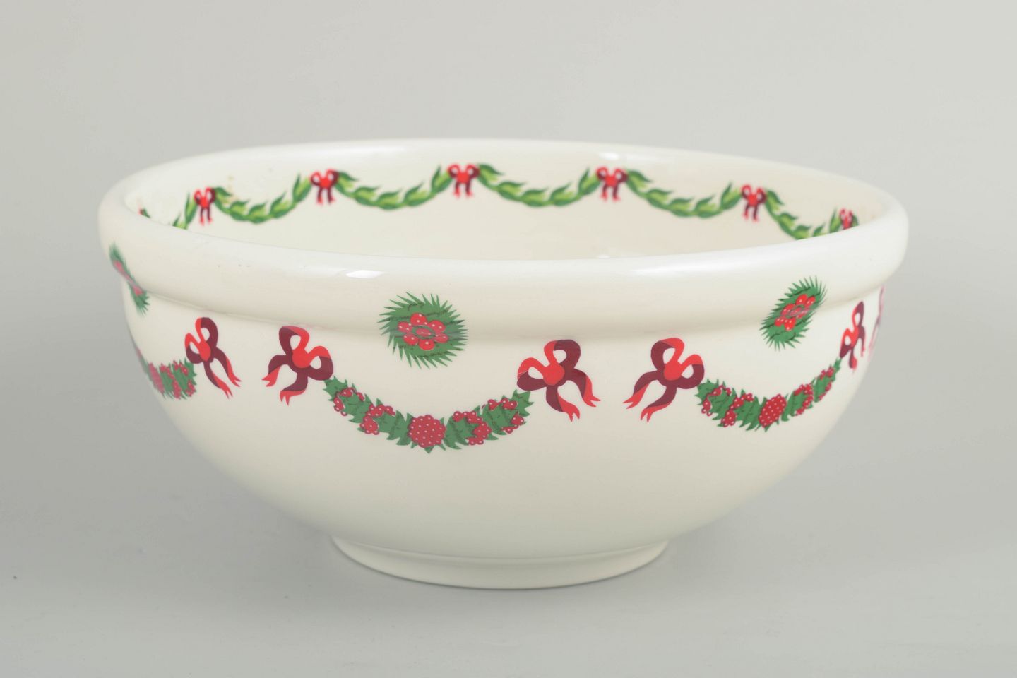 Large, round faience bowl decorated with a classic Christmas motif featuring garlands, bows and holly in red and green tones on a light ground. The bowl has a softly rounded form and displays the distinctive decorative style associated with Susan Williams-Ellis’ designs for Portmeirion.