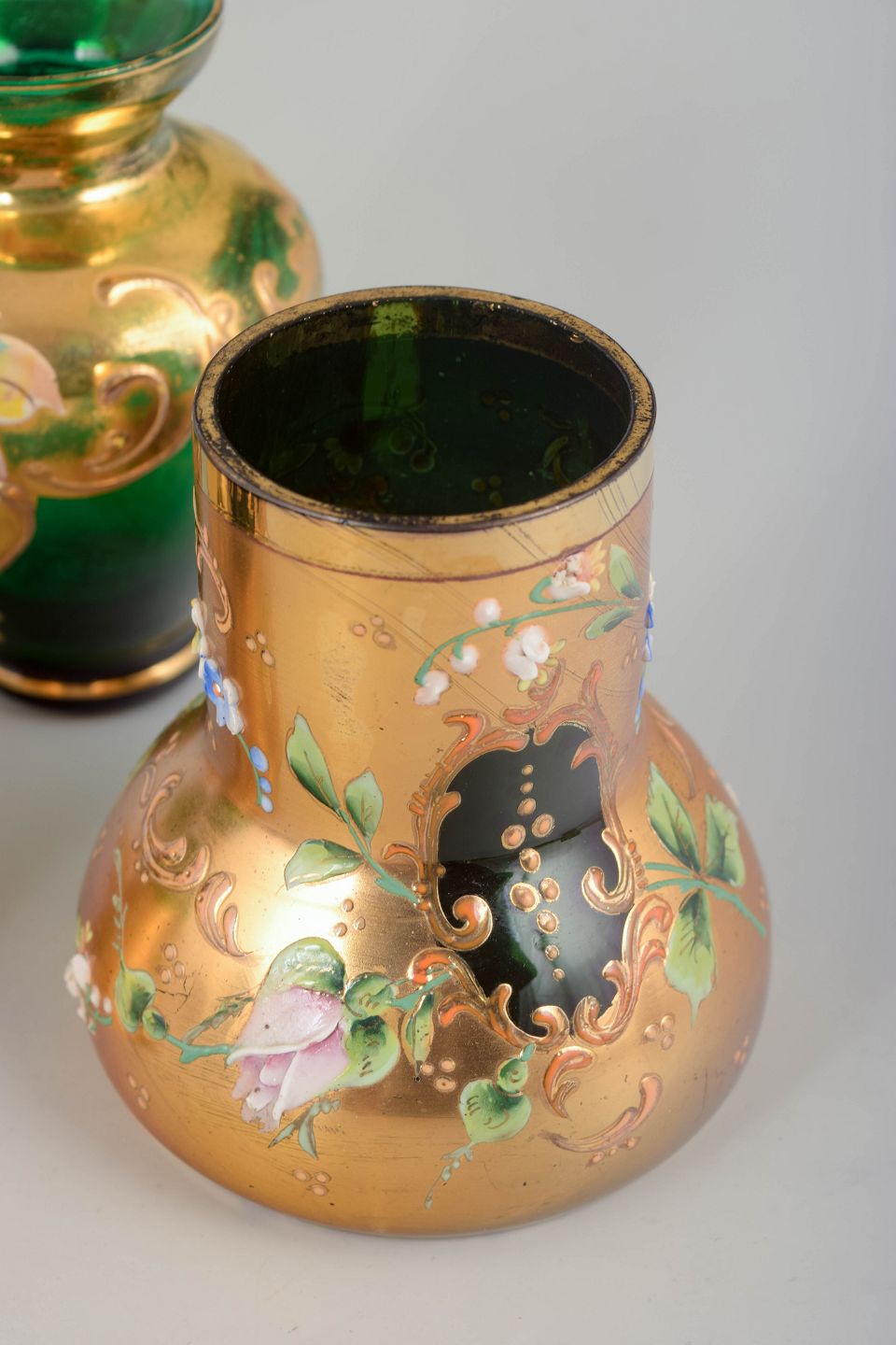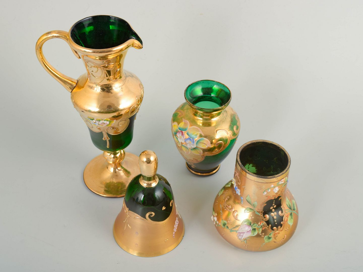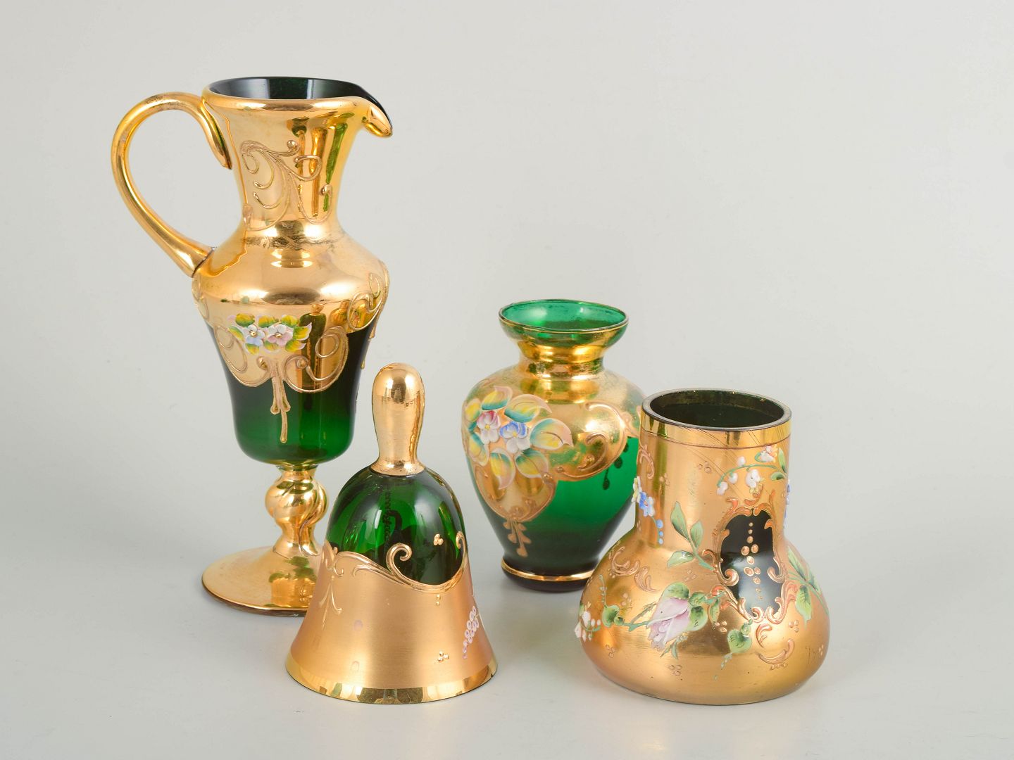 Decorative set comprising four pieces in green glass with rich gilt decoration and enamel-painted floral motifs. The set includes a small pitcher, a bell-shaped piece with finial, and two vases in varied forms. Hand made in Bohemia, showing clear variation in shape and proportions.