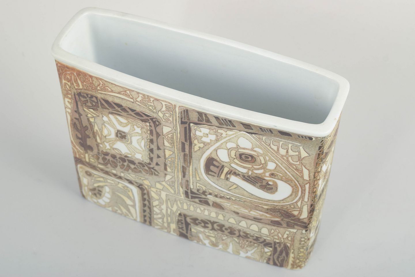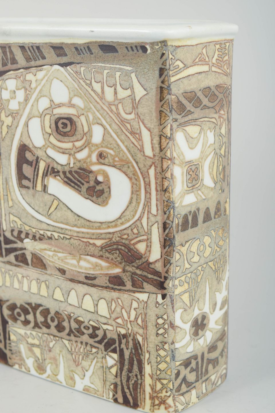 Rectangular faience vase with relief-decorated panels and characteristic geometric ornamentation in muted earth tones with lighter contrasting details. The vase is executed in Nils Thorsson’s well-known design language from the Baca series, clearly inspired by archaeological and graphic motifs. The surface has a pronounced tactile quality, with decoration integrated into the form to create a balanced and cohesive expression. Produced by Royal Copenhagen in the 1970s. Model 719/2942.