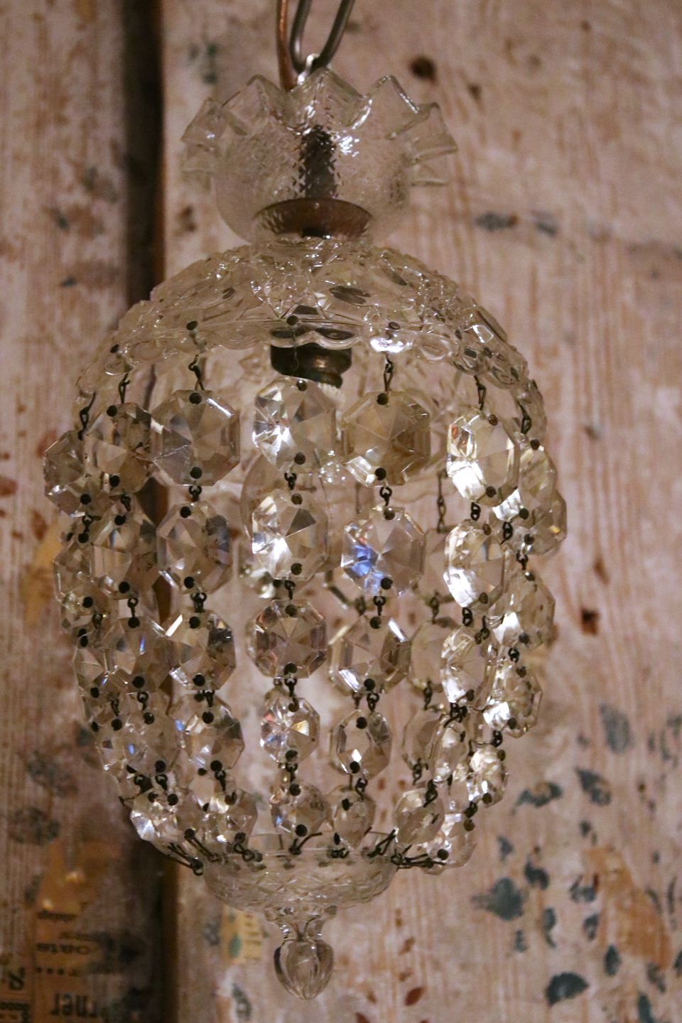 Old "bag prism" ceiling lamp, glass shade with chains of fine cut glass prisms.