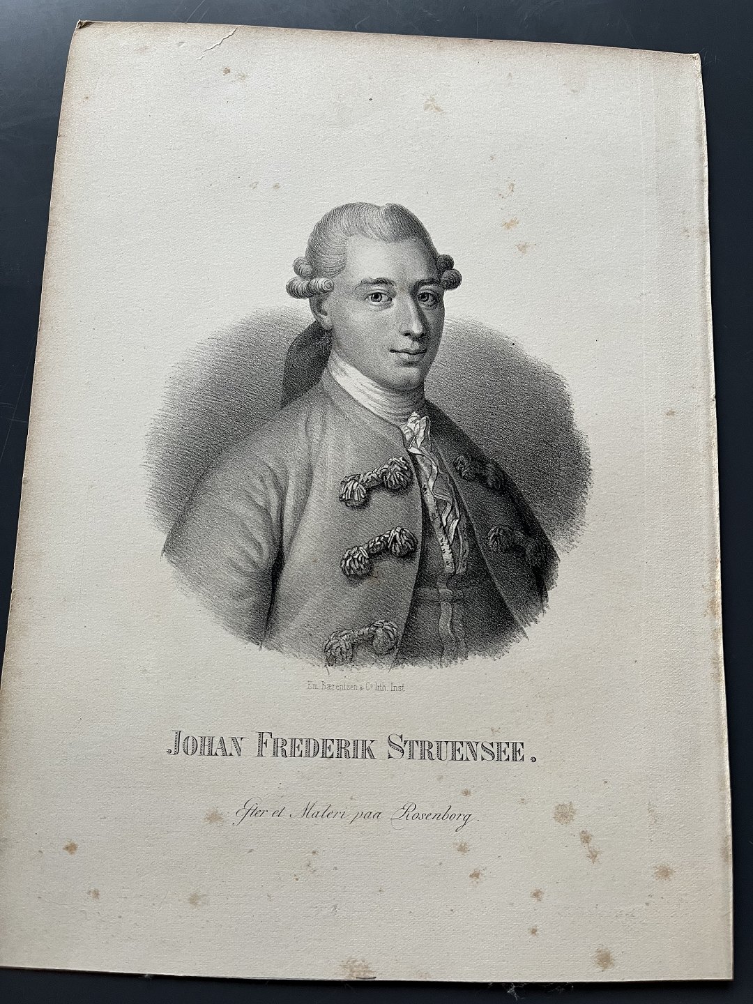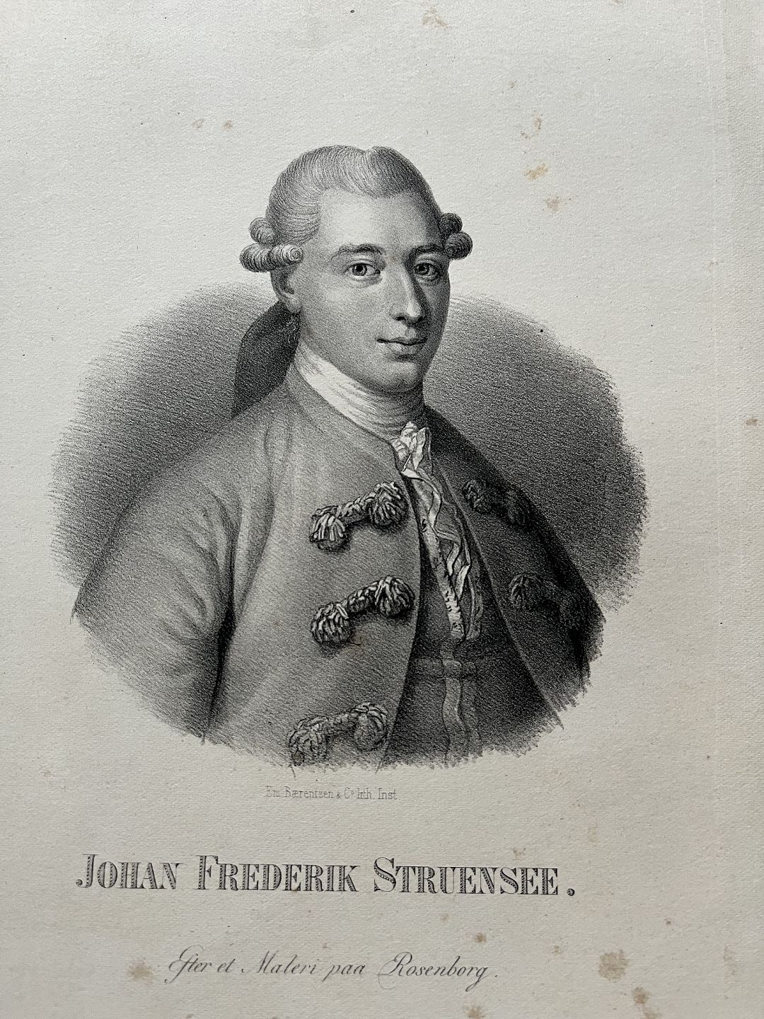 Litografi af Em. Bærentzen - Portræt af Johan Friedrich Struensee.