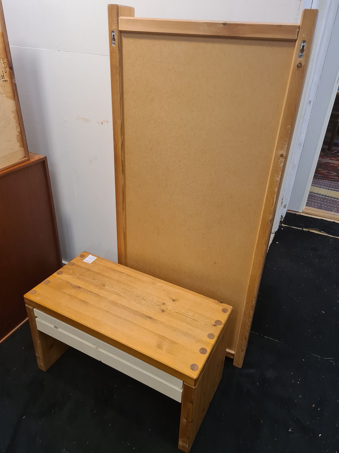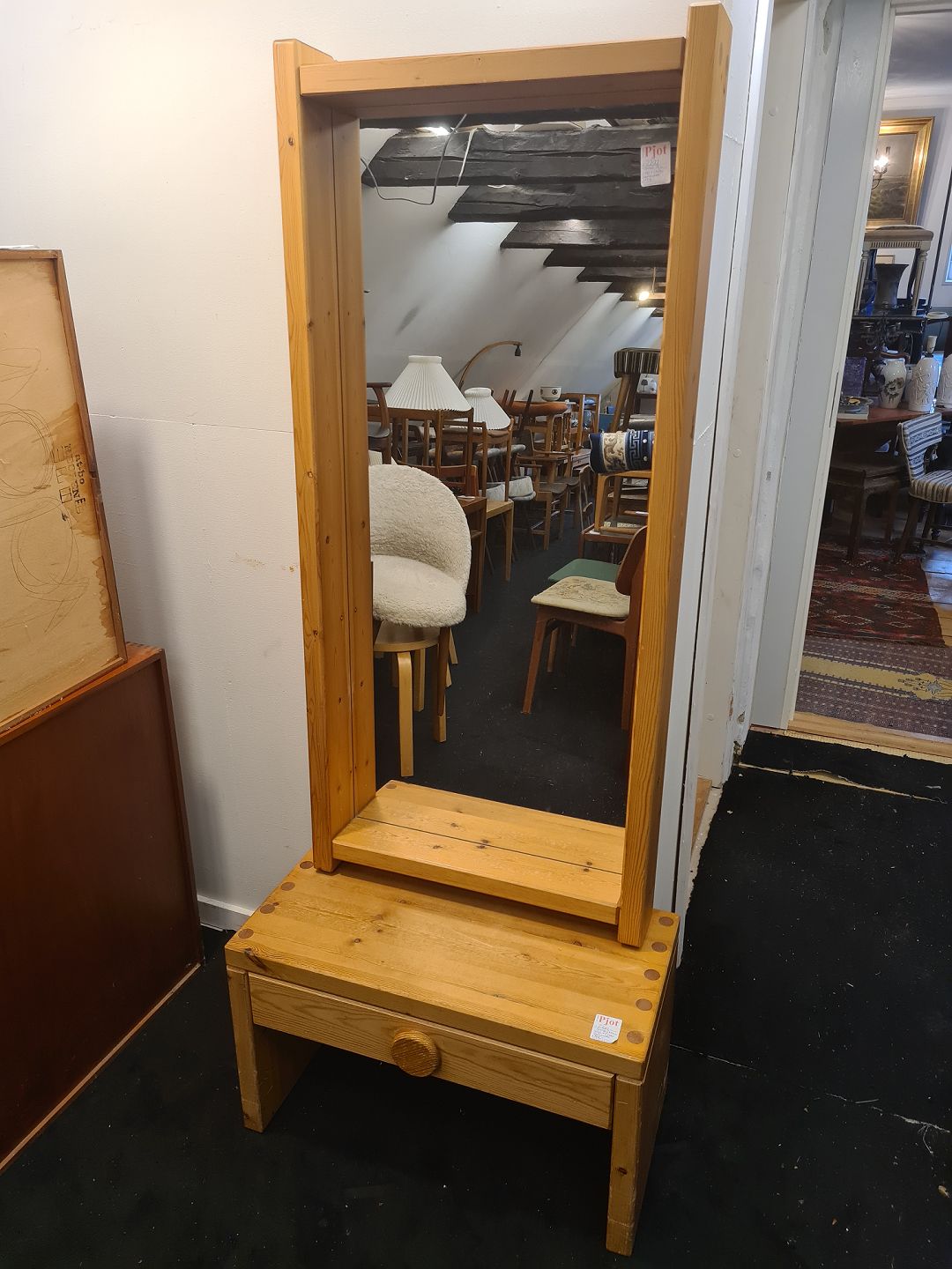Text available in Danish: Svensk produceret entré møblement bestående af kommode og spejl. Fremstillet i massiv fyr i 1980'erne. Fremstår godt og ok velholdt dog med lidt overfladiske brugsspor.