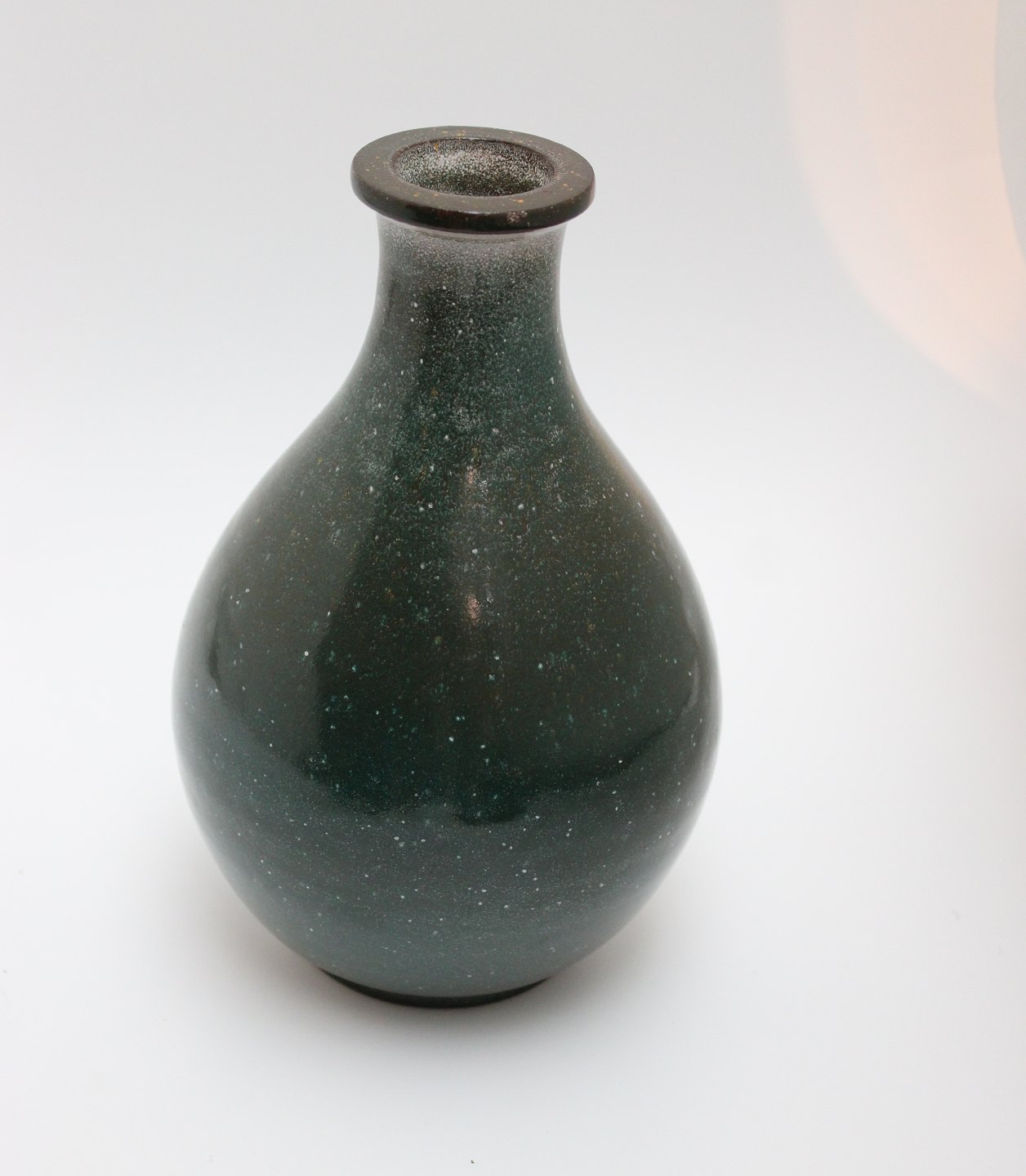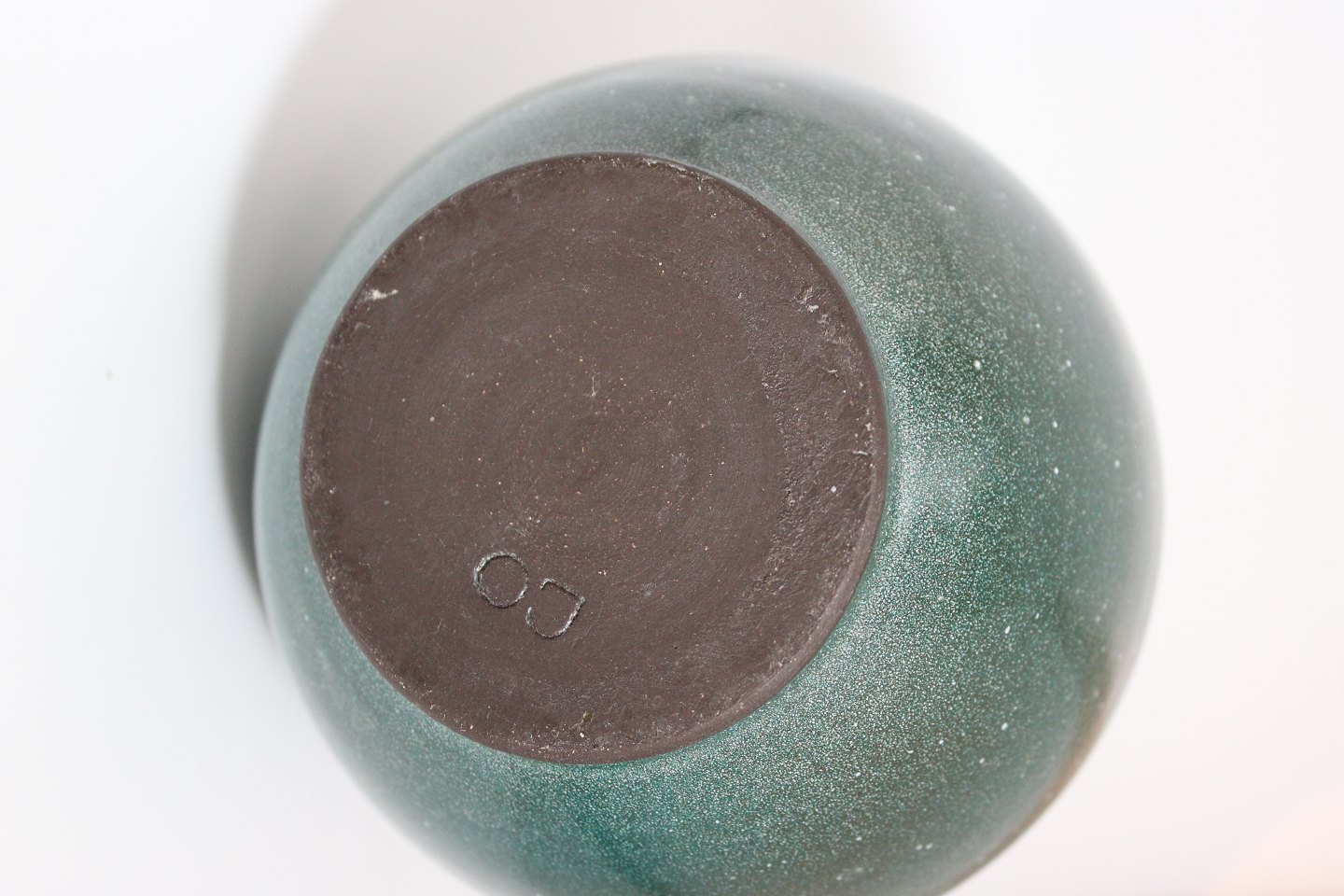 Text available in Danish: Grøn Vase af Orla Jespersen eget værksted, uddannet hos Kähler. 1948 selvstændigt keramikværksted. Flyttede til Odsherred i 1980'erne.