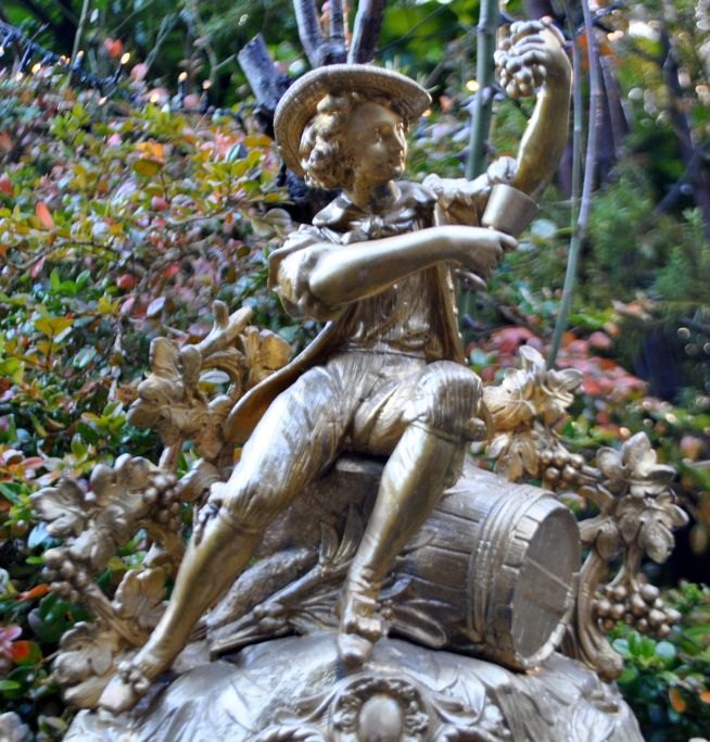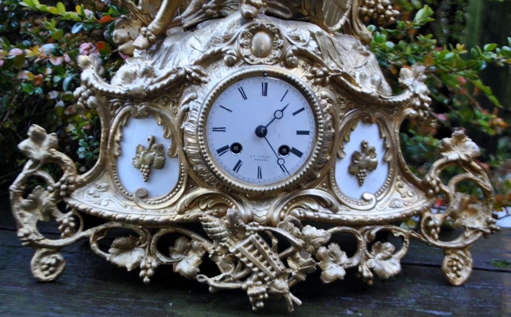 Bronzed zinc clock, c. 1870, France. Main figure of a young man sitting on top of a barrel with a mug. The entire clock is decorated with vine leaves and grapes. White enamel dial with Roman numerals. Dial signed: J. A, Hansen, Odense. H. 45 cm. W.: 42 cm. D.: 12 cm.