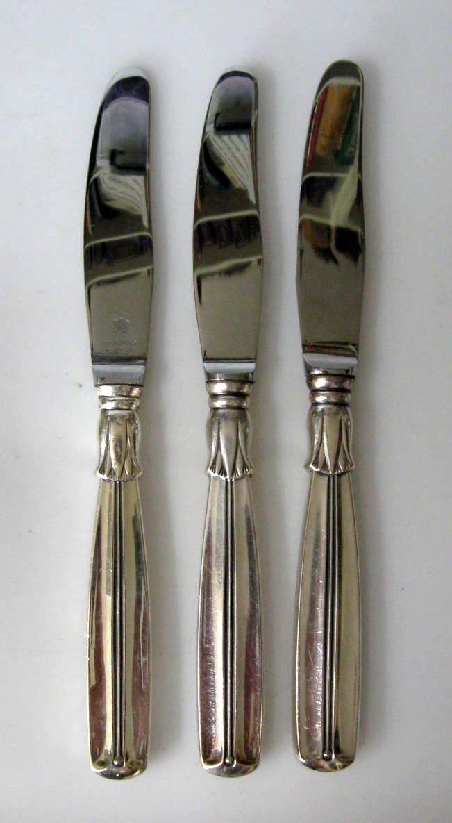 Knives. L.: 22 cm. With Raadvad knife blade. Stamped 830 s. Pt. Pt.: 25 pcs. in stock. Price per pc.: 350,- kr.