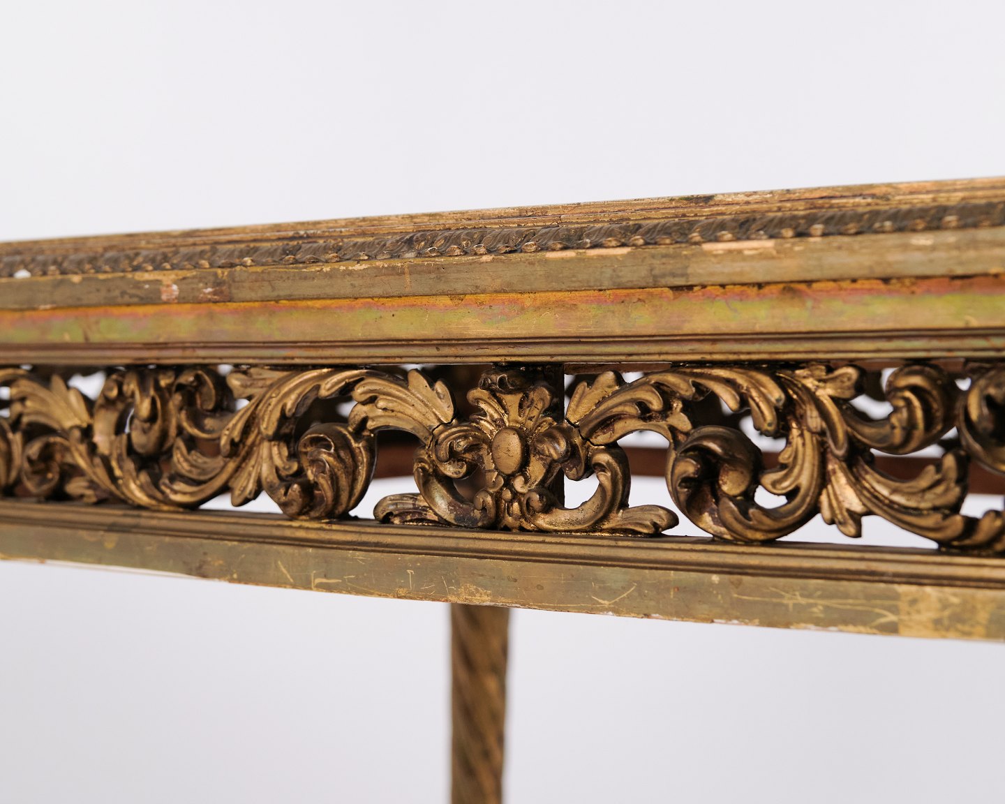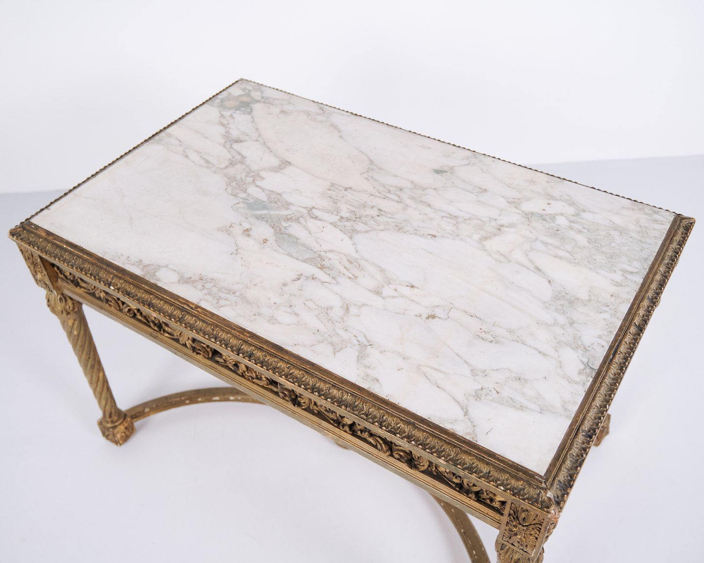 Antique Louis XVI salon table from the 1850s with marble top, gilded wood and detailed carvings. Louis XVI furniture style from the 19th century.